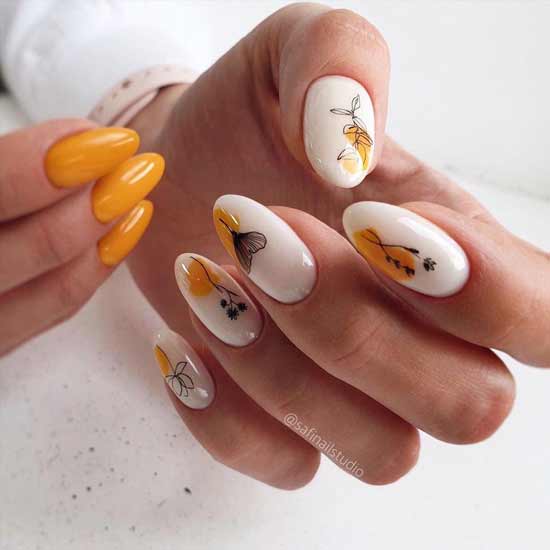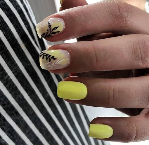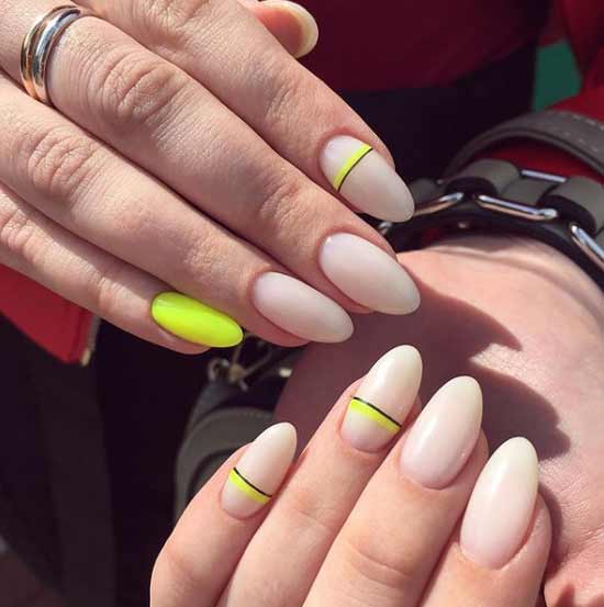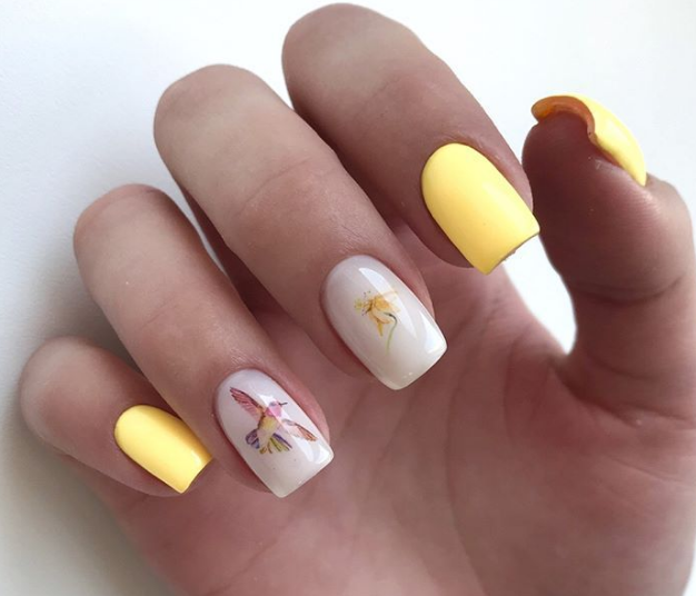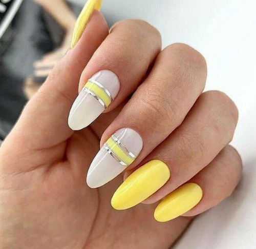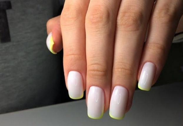 Желтый френч на молочном фоне — еще один способ сочетания кремового и «солнечного» оттенка. Дополнительно украшать ногти стразами или фольгой не обязательно — маникюр выглядит нежно и гармонично.