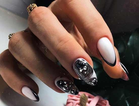 Черный френч на молочной базе — вариант, подходящий для повседневной носки и для торжественных случаев. Хорошо смотрится он на длинных ногтях овальной и квадратной формы.