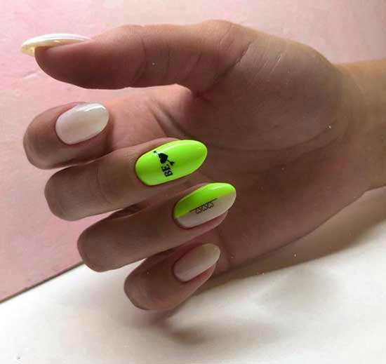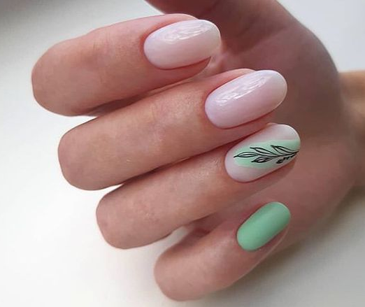 Салатовый френч на молочной базе — модный вариант, подходящий для ежедневной носки. Также эти оттенки можно комбинировать друг с другом во время выполнения маникюра «разные руки». Салатовым лаком на ногтях прорисовывают принты.