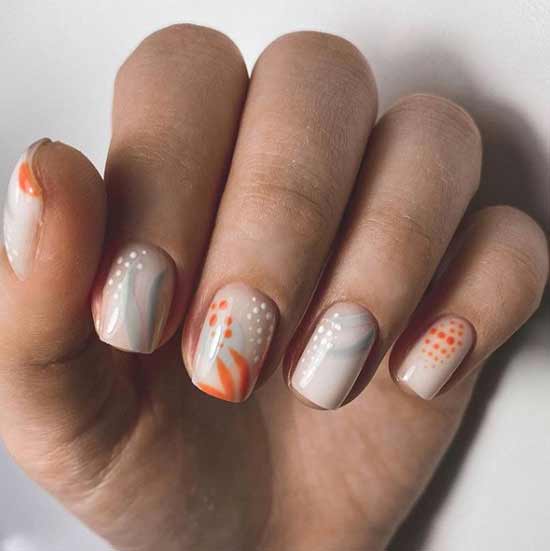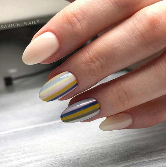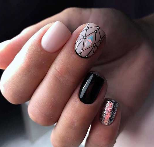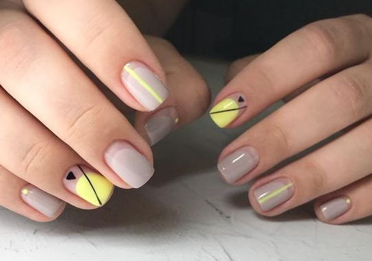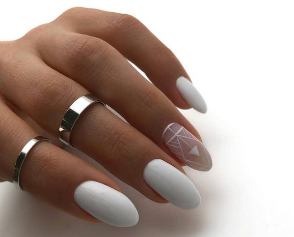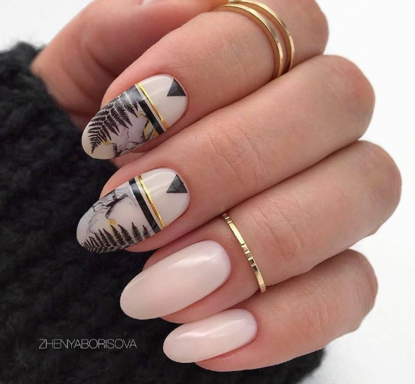 Маникюр в молочных тонах позволяет проявить фантазию. Можно экспериментировать с дизайном и цветами. Молочный, кремовый или нежно-бежевый оттенок хорошо сочетается с черным, белым, голубым, красным, желтым и салатовым. Орнамент, геометрические фигуры, линии и другие рисунки изображают золотым или серебристым лаком.