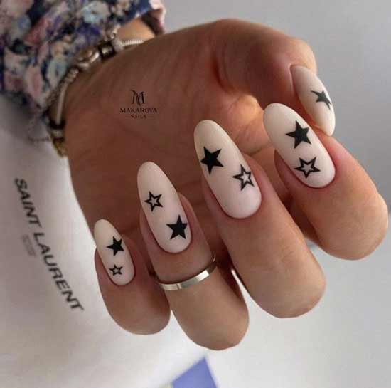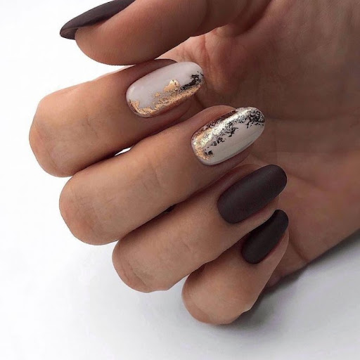 Утонченно смотрится цвет молочного шоколада на ногтях. Дизайн может быть разным — стрелки, линии, фигуры, точки. Маникюр с наклейками нетрудно сделать самостоятельно, заранее приобретя слайдеры в специализированном магазине.