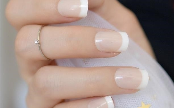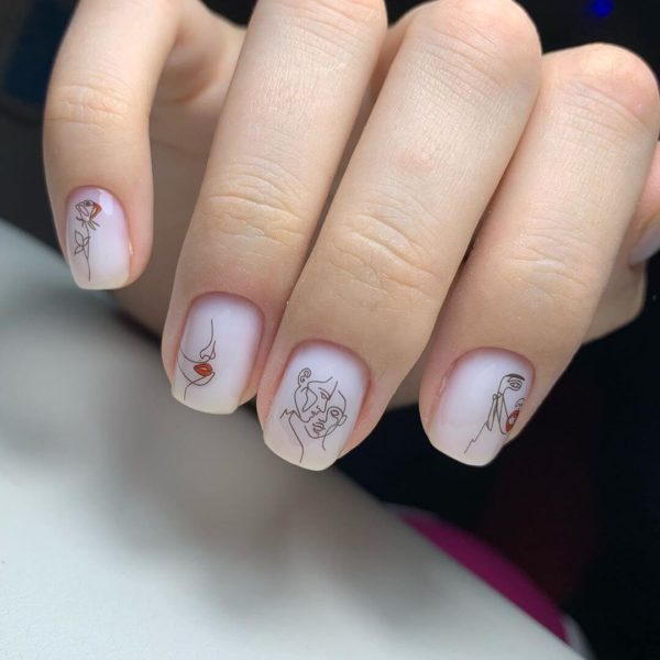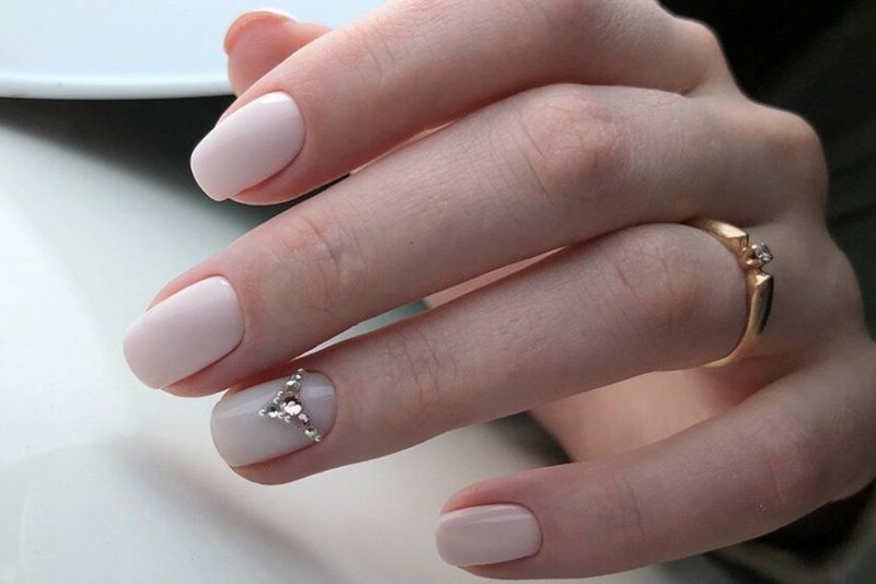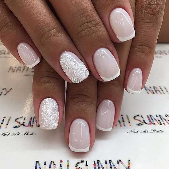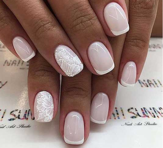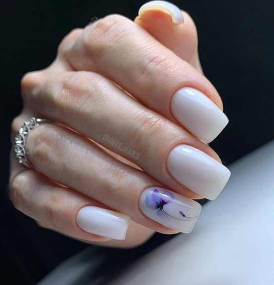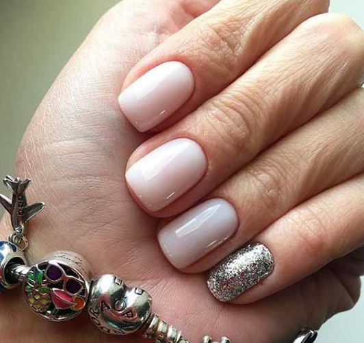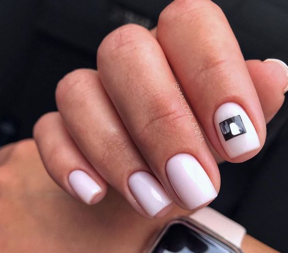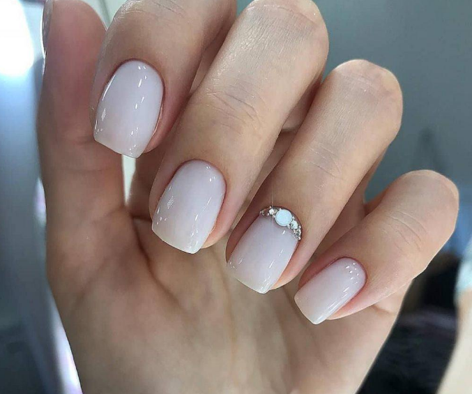 Маникюр молочный с дизайном на короткие ногти квадратной формы легко выполнить в домашних условиях. Базу нужно наносить в несколько слоев.