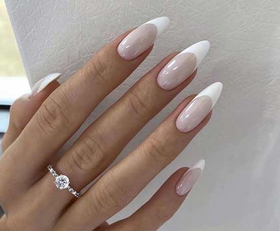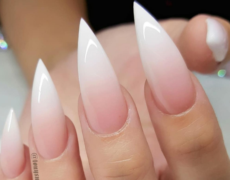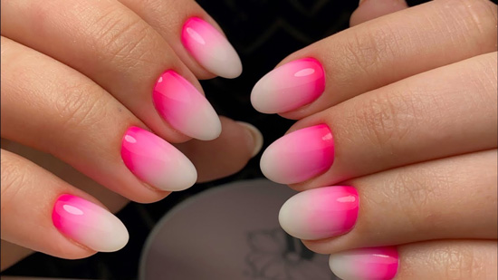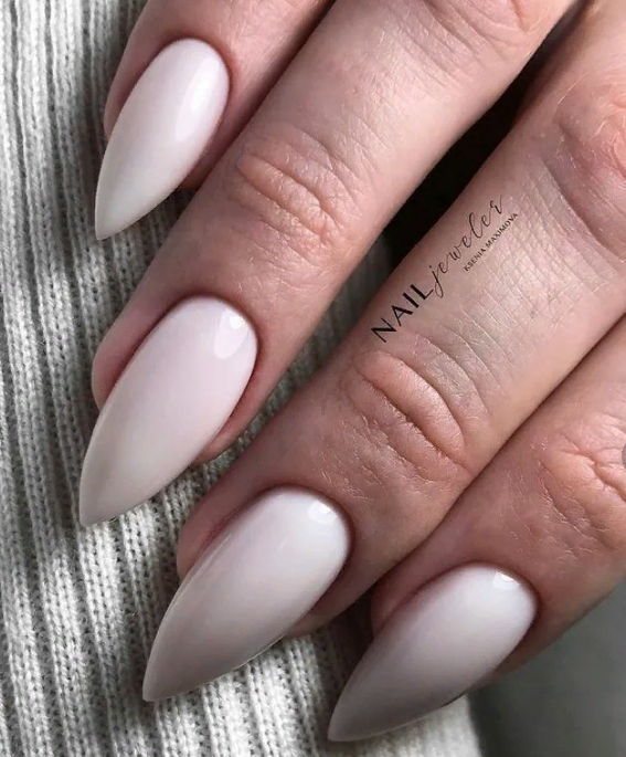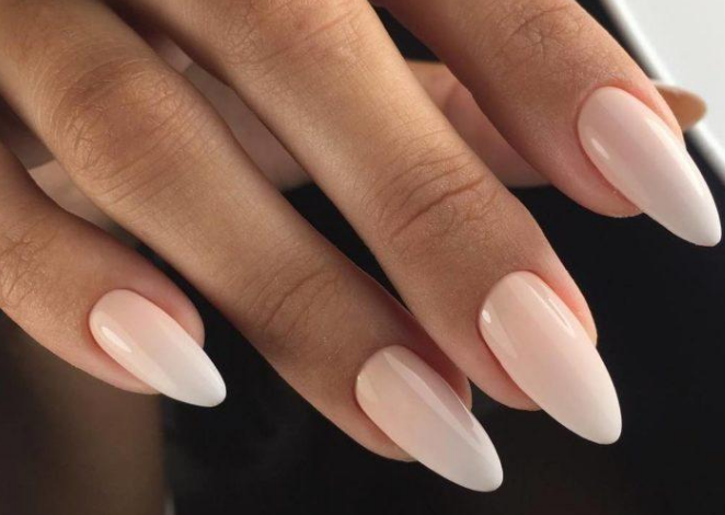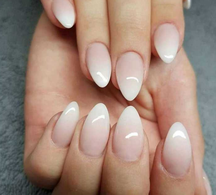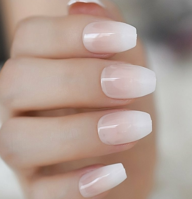 Переход можно расположить вертикально или горизонтально. Также популярностью пользуется новая техника: плавный переход выполняют от пальца к пальцу. Лак молочного цвета наносят на мизинец, на безымянный — на оттенок светлее, на средний — еще светлее. Ноготь большого пальца покрывают полупрозрачным белым лаком.