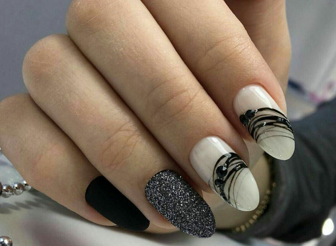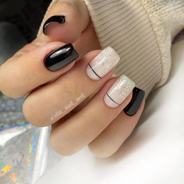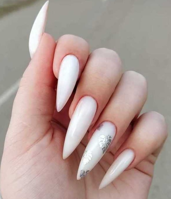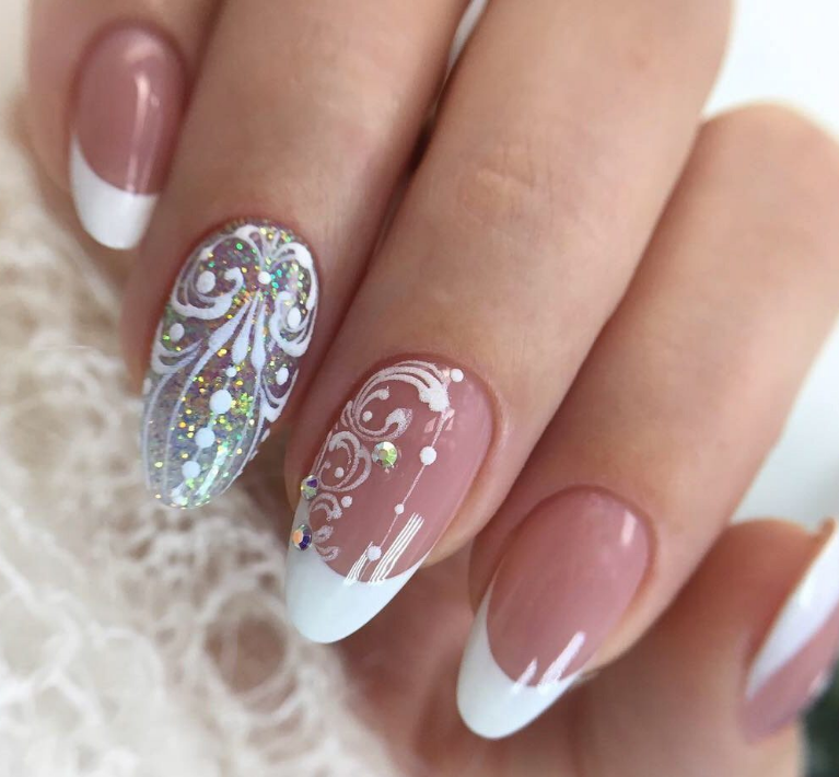 Серебряным или золотым лаком можно рисовать на молочном фоне. Оригинально смотрятся витиеватые узоры или орнамент, выполненный в энтическом или арт-стиле. В качестве украшения дизайна используют блестки.