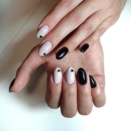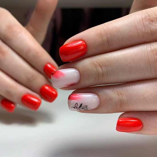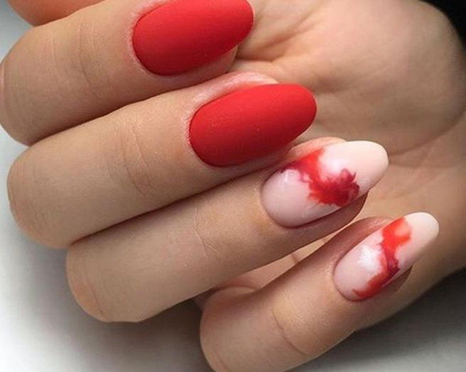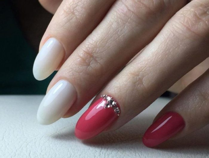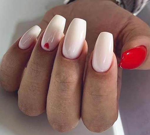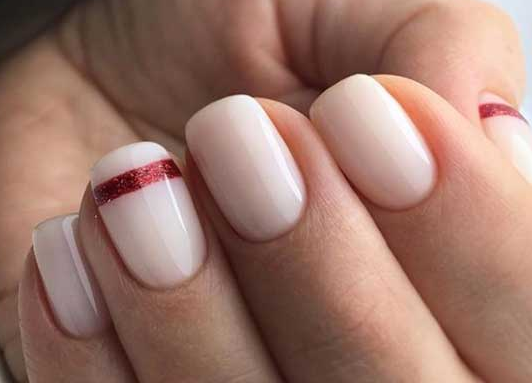 Этот вариант маникюра подходит чувственным и дерзким натурам. Красный оттенок — холодный, немного агрессивный. Молочный — наоборот, теплый и нежный. Красным лаком можно изобразить узоры, фигуры, линии или точки на кремовом фоне. Украшают ногти стразами или фольгой.