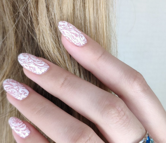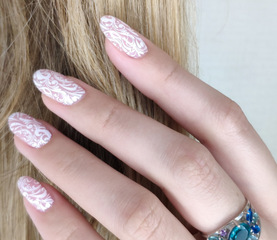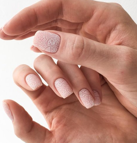 Стемпинг выполняют на ногтях разной длины. Рисунок аккуратно переносят на пластину штампом с трафарета. Для создания арт-маникюра используют несколько цветов. На молочную базу можно нанести трафаретный рисунок любого оттенка.