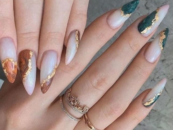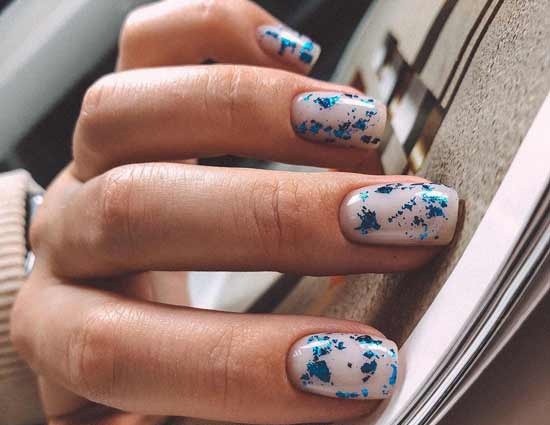 Важно. На квадратных ногтях элегантно смотрится золотая фольга или втирка. Можно сконцентрировать внимание на 2-3 пальцах. Остальные достаточно просто покрыть базой.