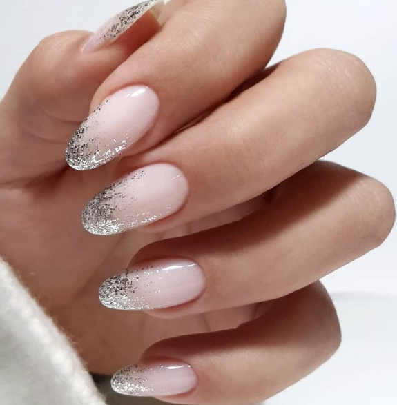 Градиент с блестками под молочной базой можно сделать обычным лаком. Основное условие — наличие плавных переходов от цвета к цвету. Техника выполнения омбре подразумевает использование нескольких цветов. Желательно комбинировать друг с другом не менее 2 оттенков.