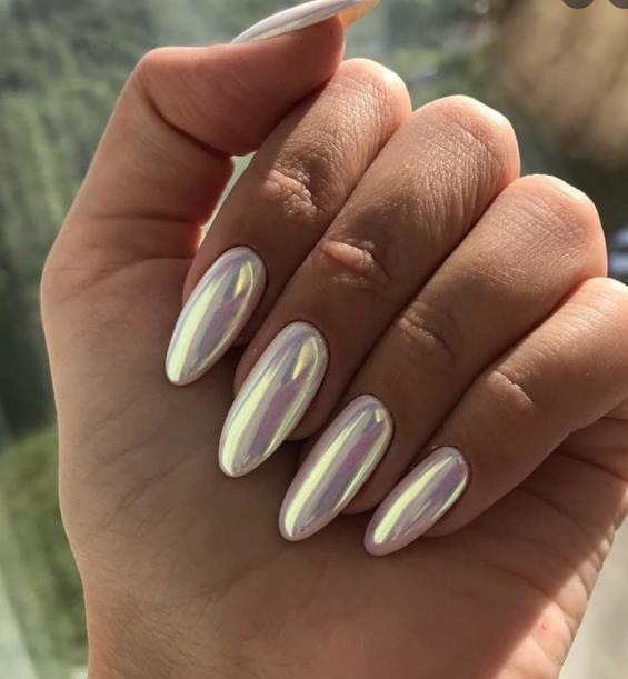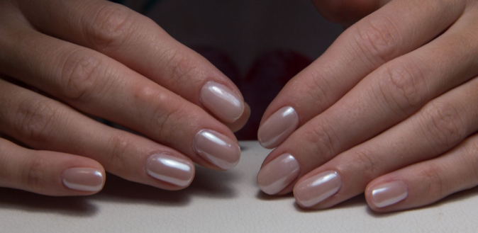 Втирку используют при создании зеркального или матового маникюра. Она придает ногтевой пластине металлический блеск. На молочной базе хорошо будут смотреться фиолетовые, зеленые, розовые, серебряные или золотистые переливы.