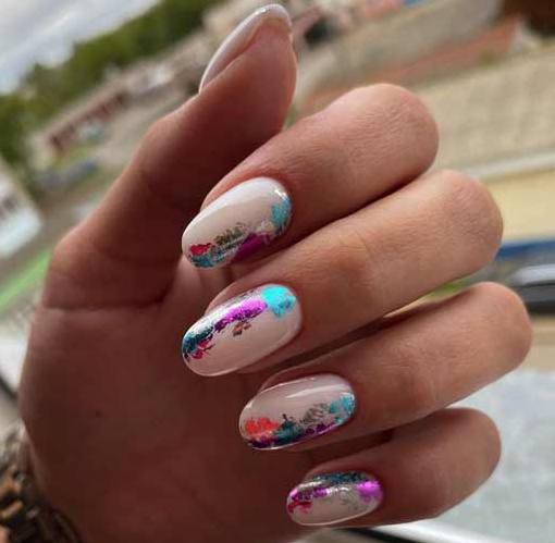 Металлизированный материал наносят обычно на одну из сторон (правую, левую) ногтя. Так фольга подчеркнет длину и форму. Дизайн можно дополнить градиентом или любым несложным рисунком.