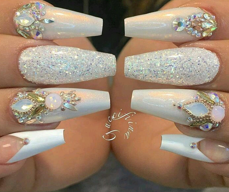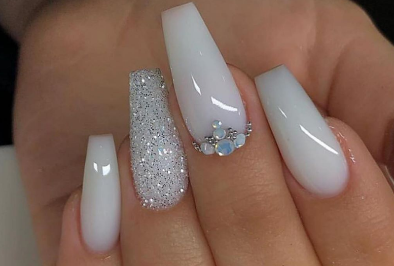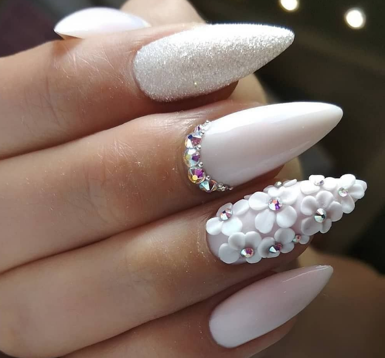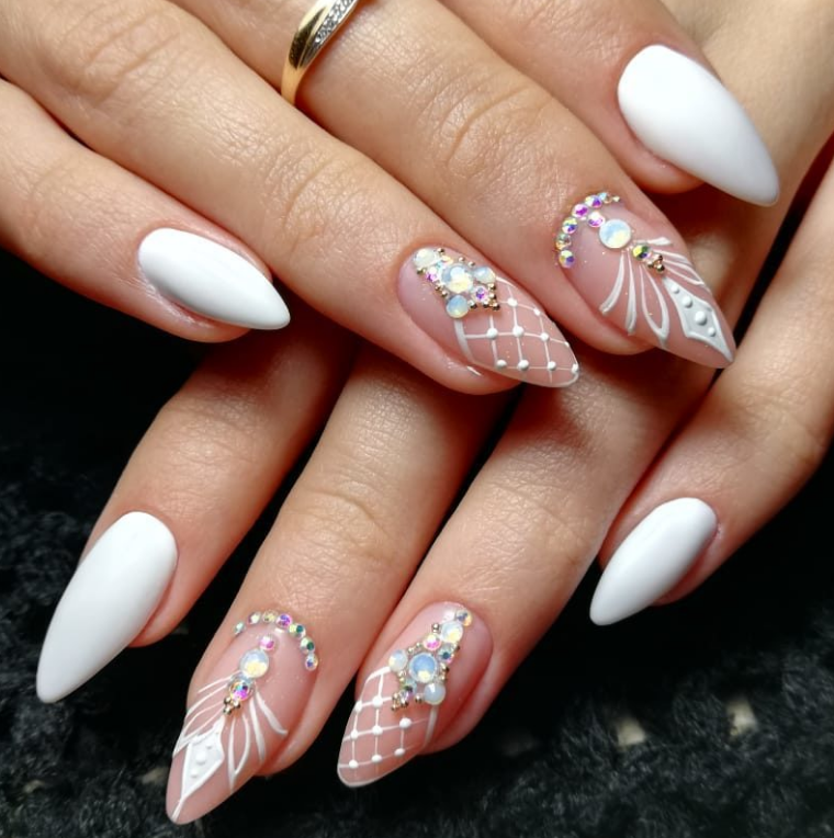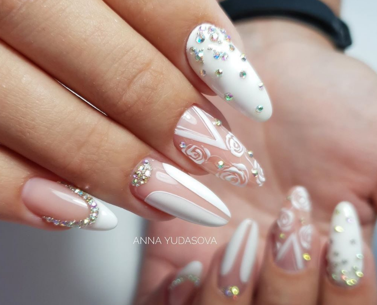 Опытные нейл-мастера создают целые композиции, изображая цветы, фигурки животных, луну, солнце, листья. Украсить камнями можно один или несколько пальцев. Такой вариант молочного маникюра подойдет для торжественных случаев.