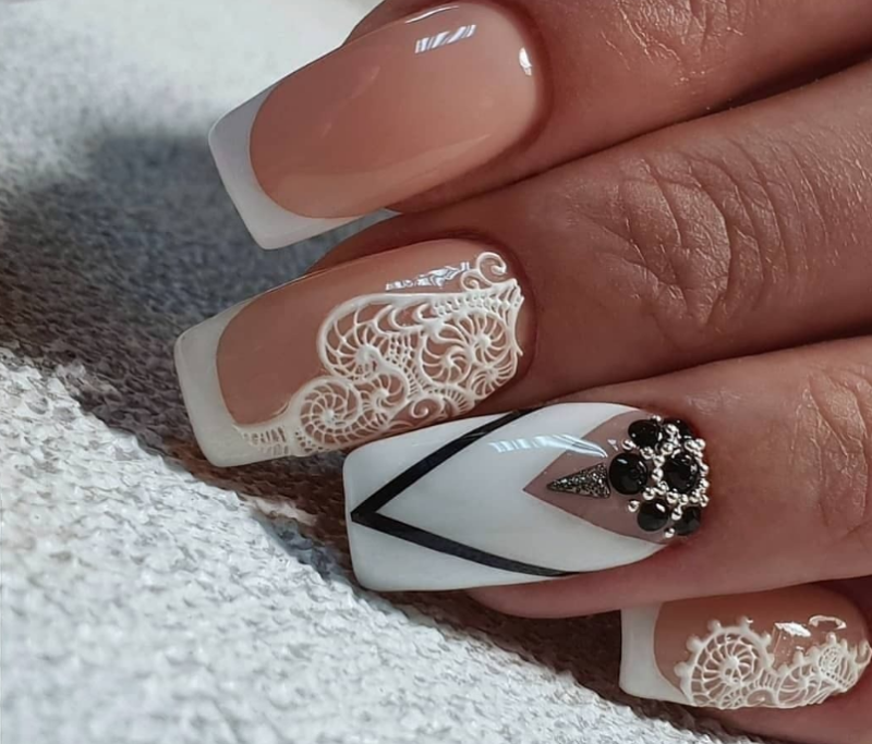 Дизайн ногтей с молочным цветом предполагает несколько вариантов оформления. Кремовое покрытие одинаково хорошо смотрится и на длинных, и на коротких пальцах. Популярный вариант — яркий френч на молочной базе. Бежевое покрытие на ноготь наносят в 2-3 слоя, затем прорисовывает на засохшем лаке линии, геометрические фигуры, орнаменты. Дополнить дизайн можно блестками или стразами.