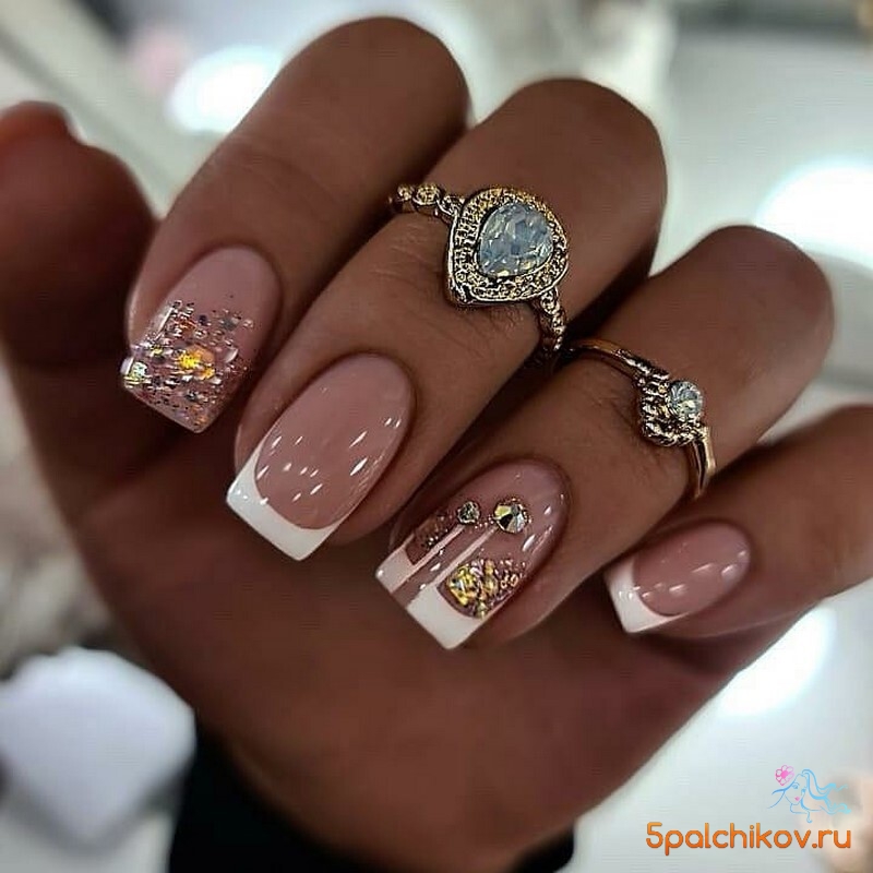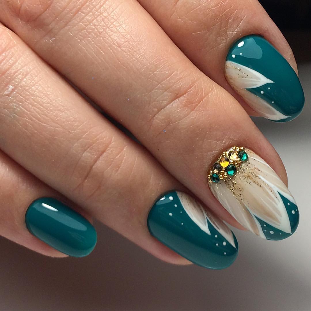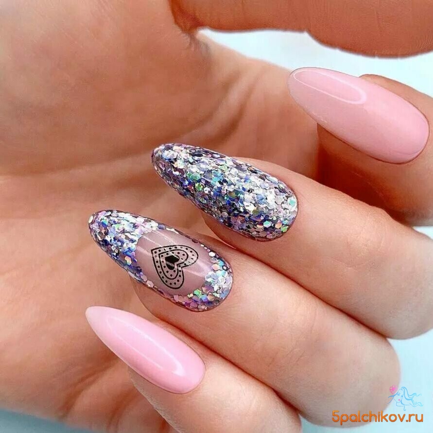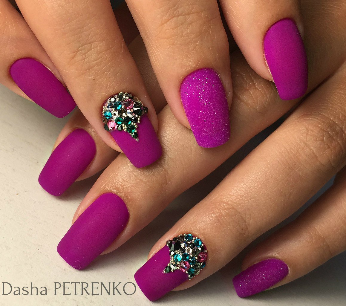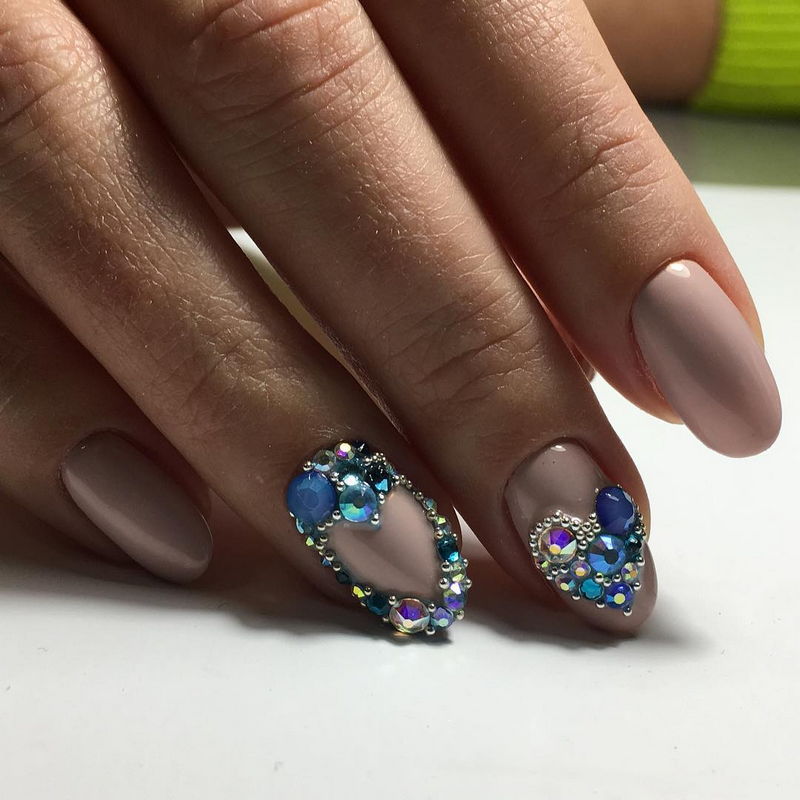 Совет: достаточно акцента на одном ноготке. И помните — чем больше рисунков, тем меньше блесток. Чем короче длина ногтей, тем меньше размер камней.