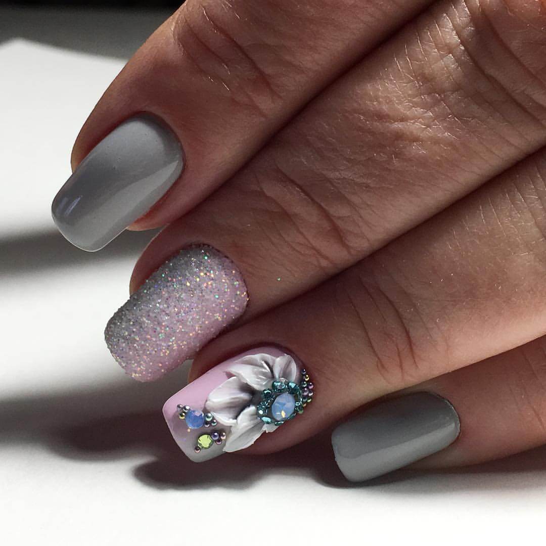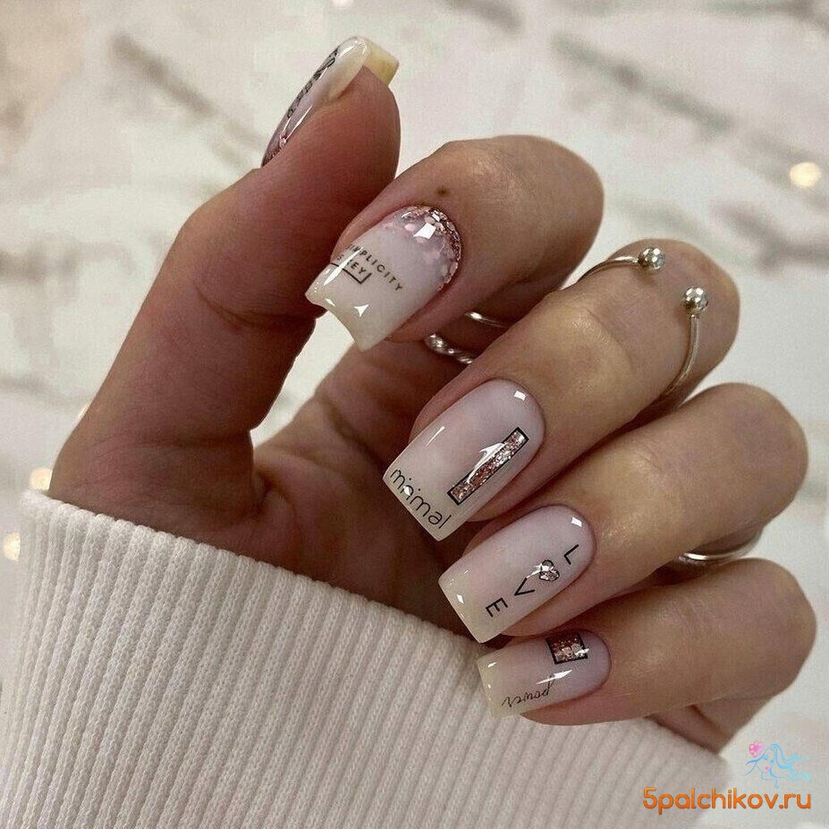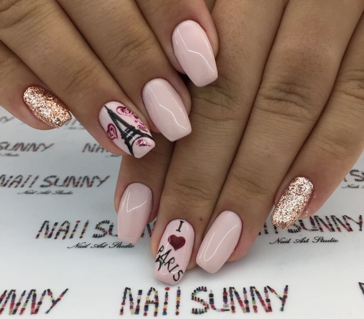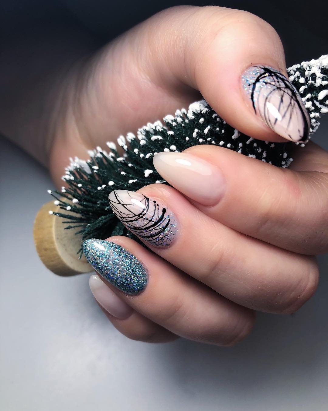 Совет: достаточно акцента на одном ноготке. И помните — чем больше рисунков, тем меньше блесток. Чем короче длина ногтей, тем меньше размер камней.