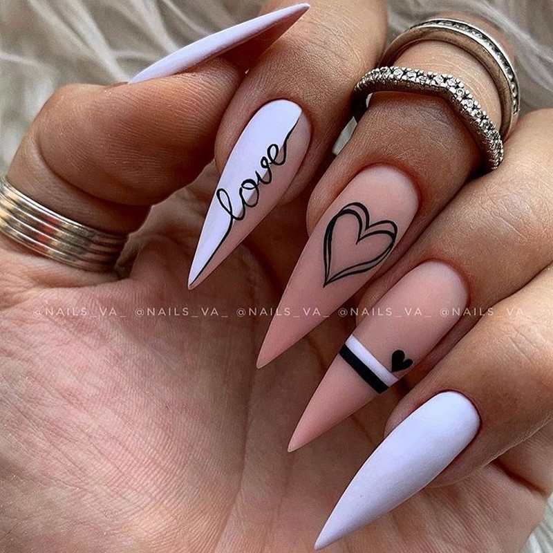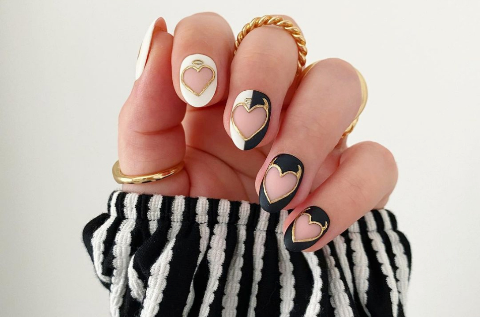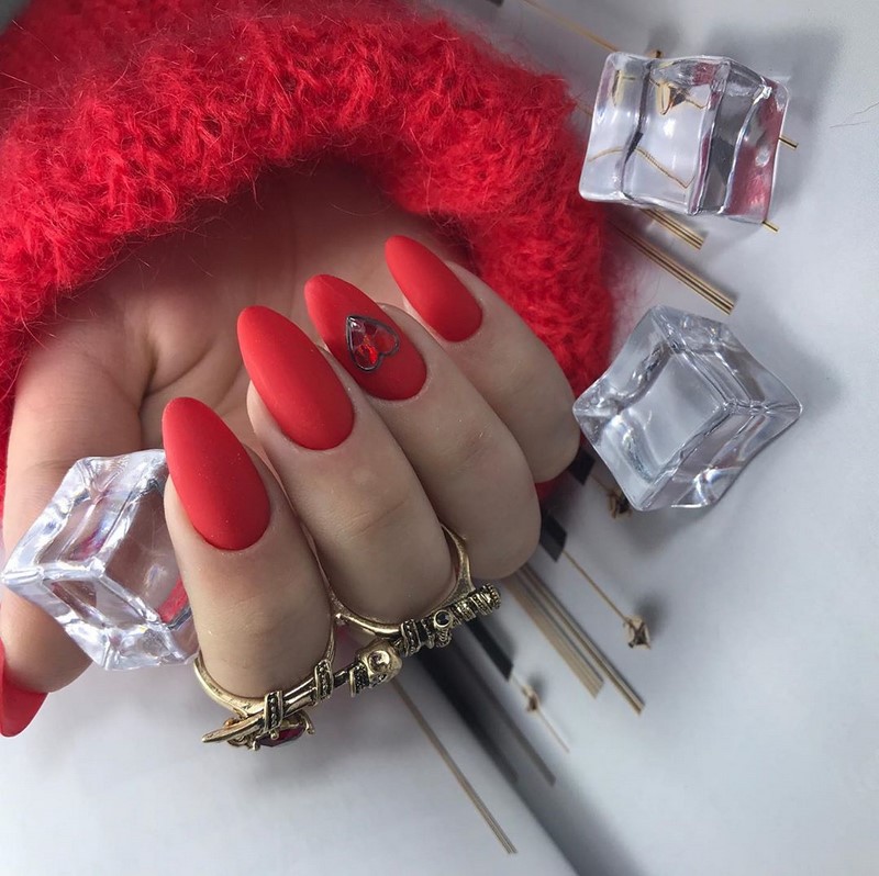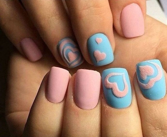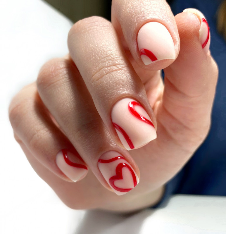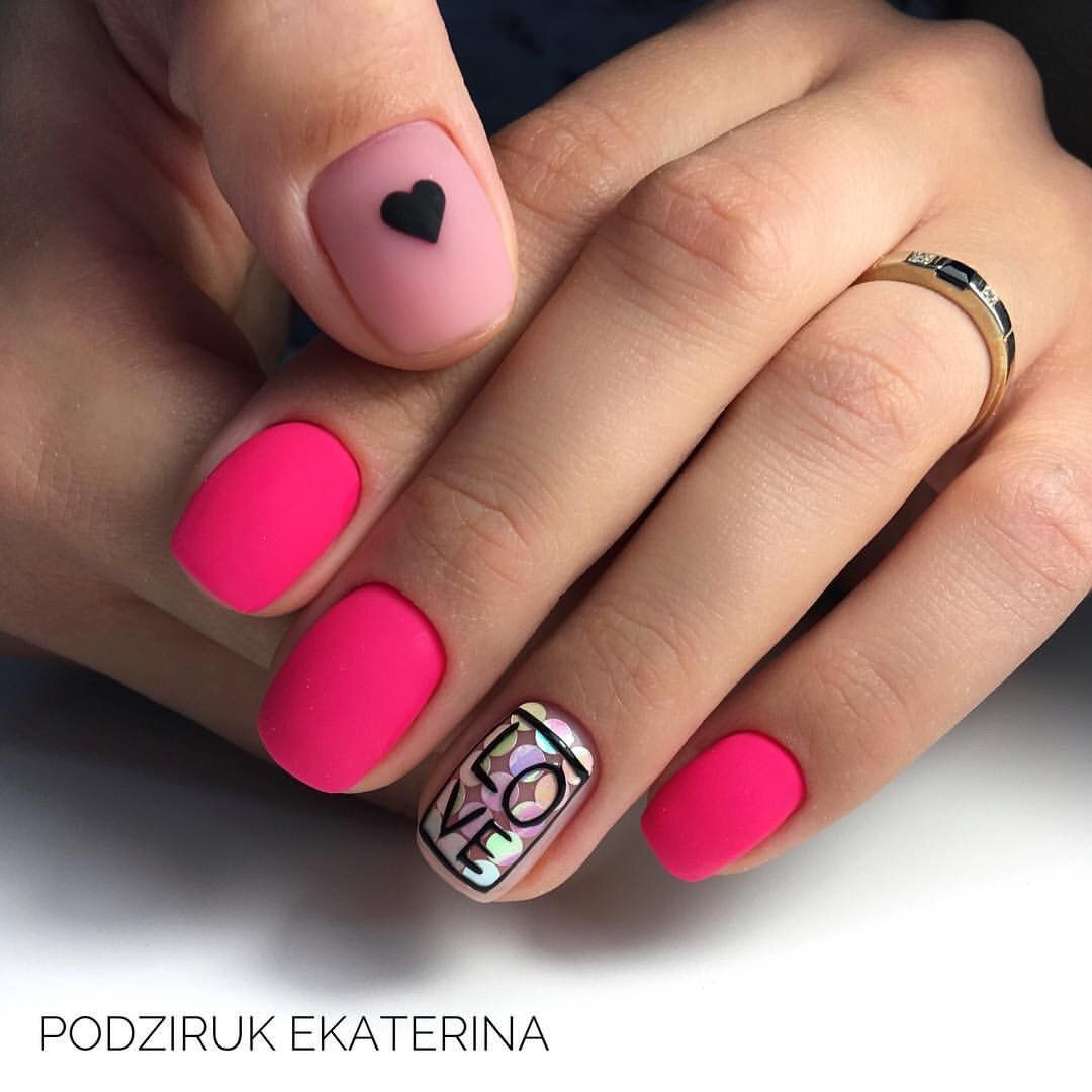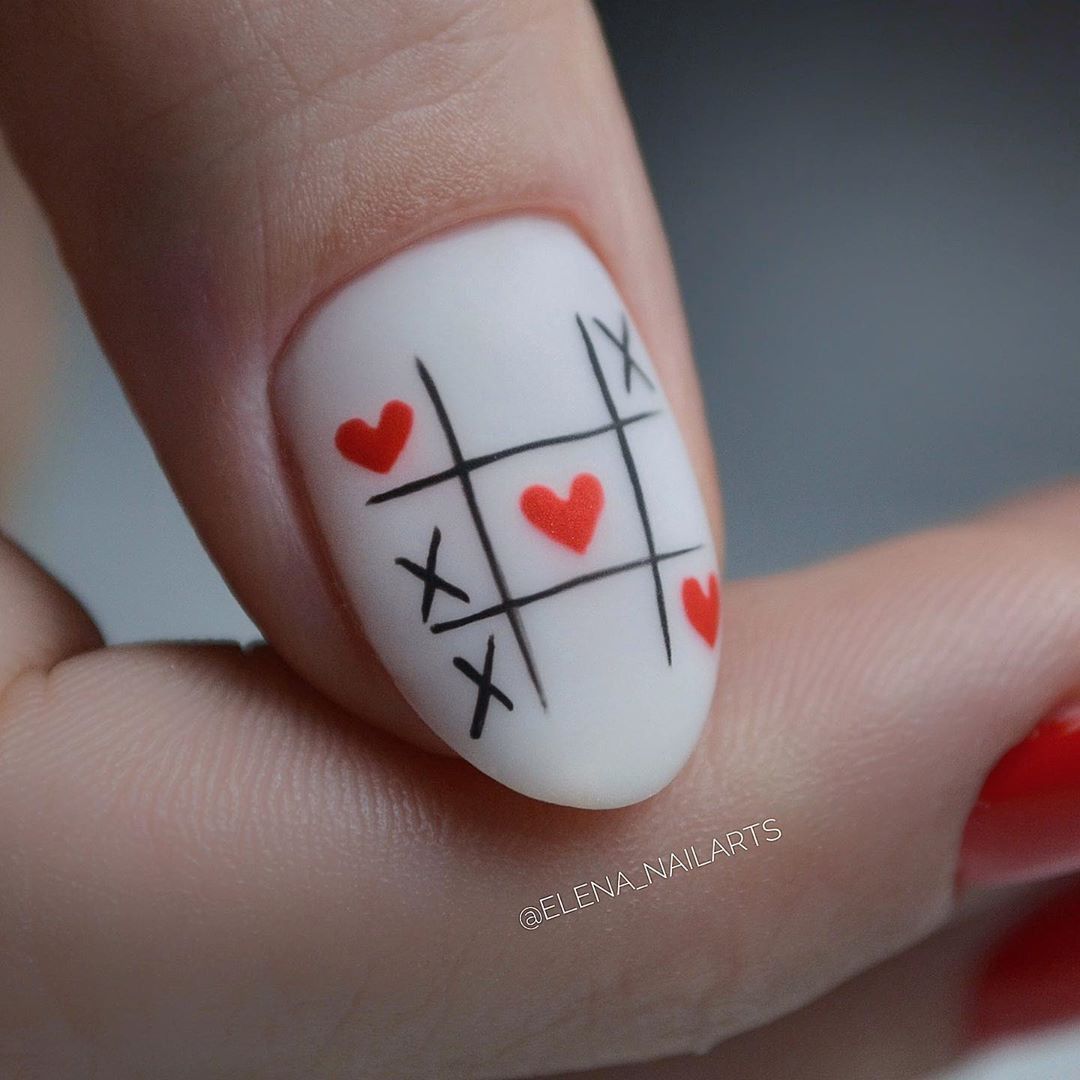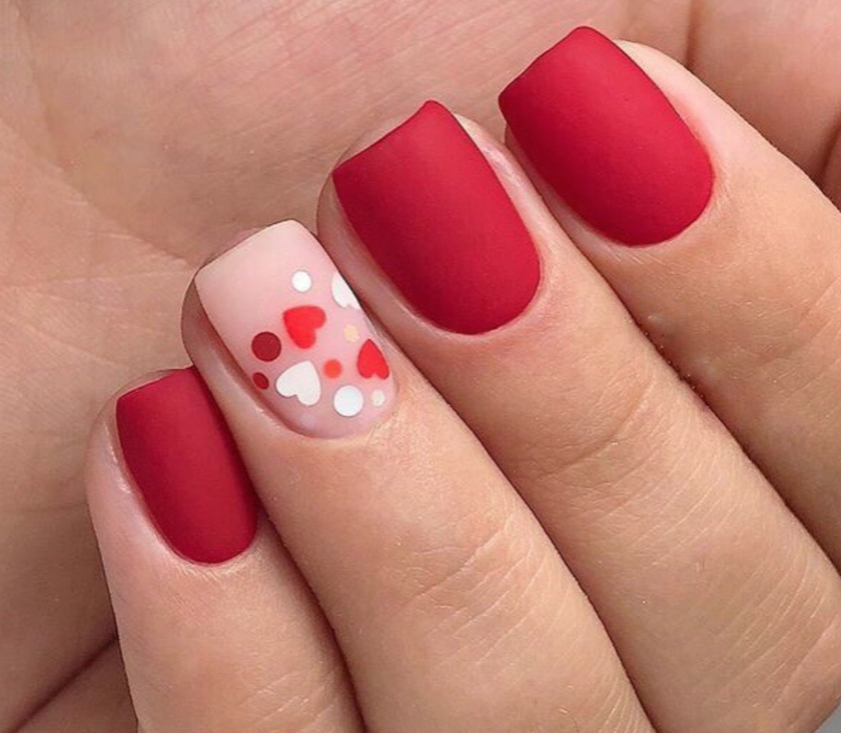 Первое, что приходит на ум в День святого Валентина — маникюр с сердечками. Они будут повсюду, поэтому обязательно стоит повторить их в дизайне ногтей. Но не будьте банальны, выбирайте самые разные цветовые сочетания и фактуры. Например, сердечко можно не рисовать или наклеивать, а создать маникюр в стиле негатив спейс, оставит «голове» пространство в виде сердца. Такой прием хорошо смотрится на матовой текстуре.