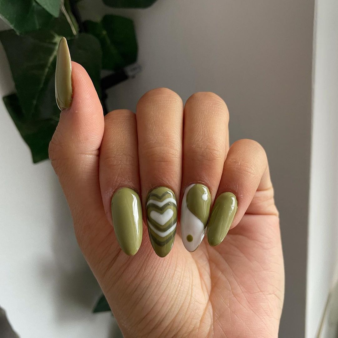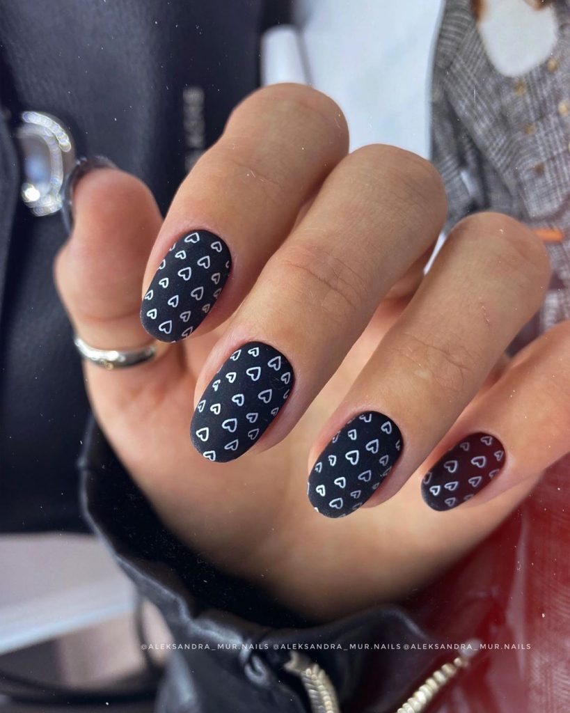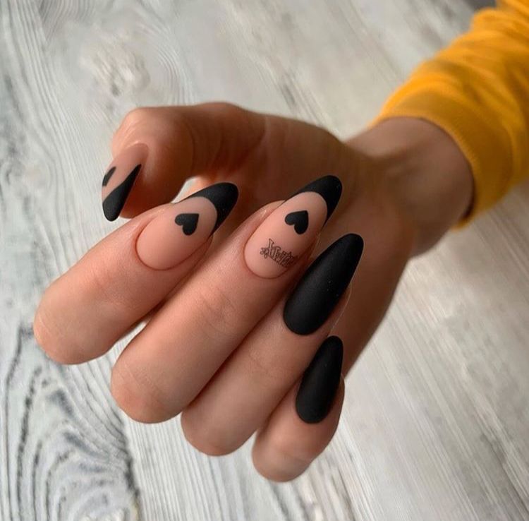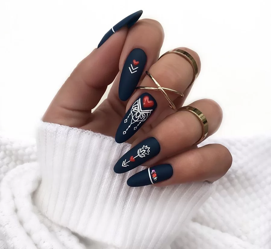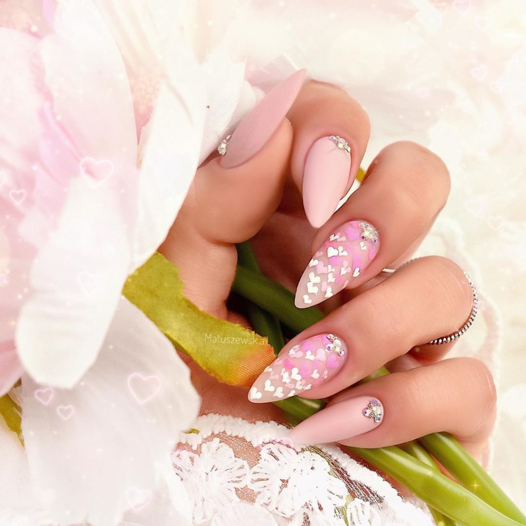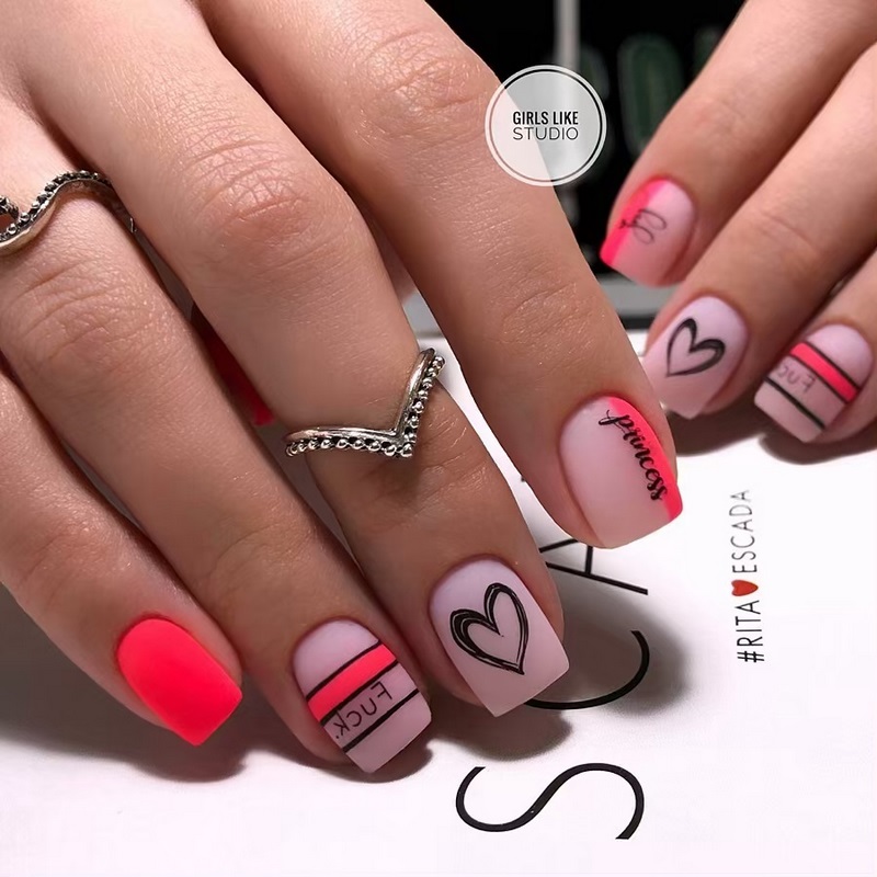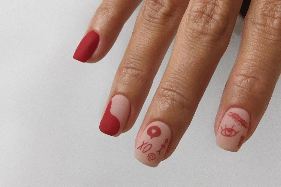 Первое, что приходит на ум в День святого Валентина — маникюр с сердечками. Они будут повсюду, поэтому обязательно стоит повторить их в дизайне ногтей. Но не будьте банальны, выбирайте самые разные цветовые сочетания и фактуры. Например, сердечко можно не рисовать или наклеивать, а создать маникюр в стиле негатив спейс, оставит «голове» пространство в виде сердца. Такой прием хорошо смотрится на матовой текстуре.