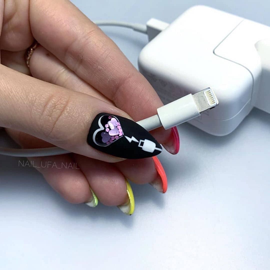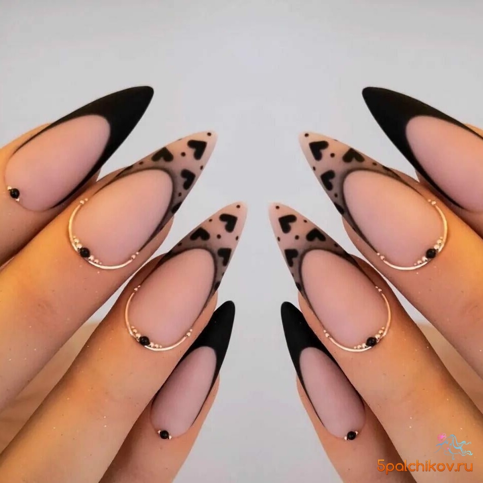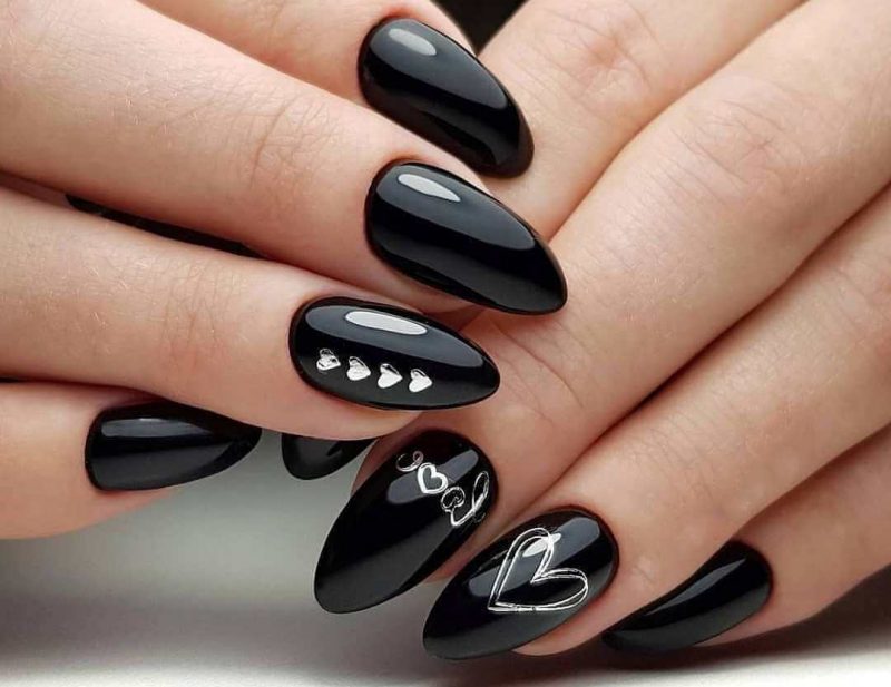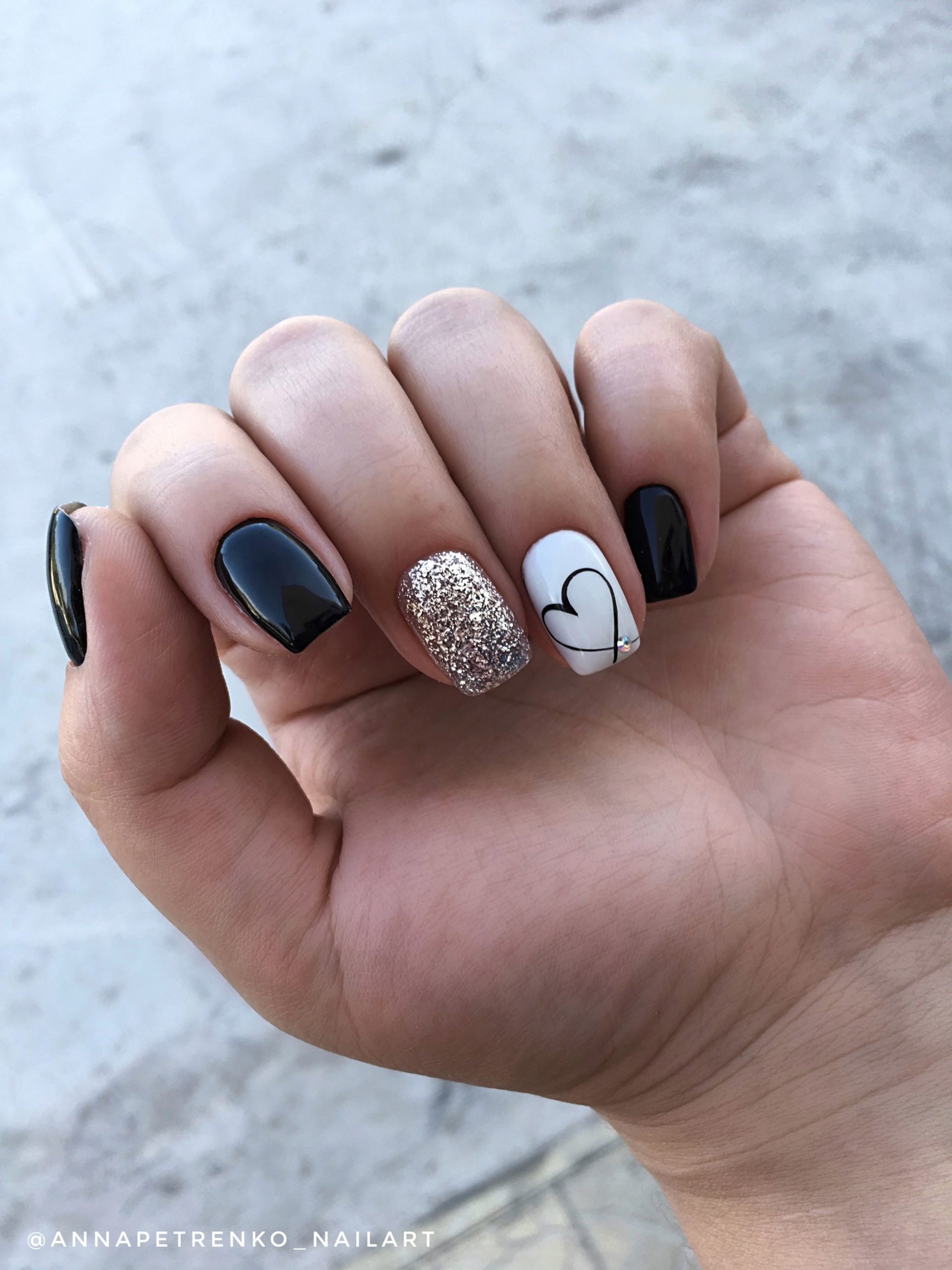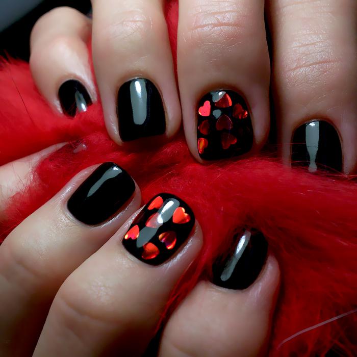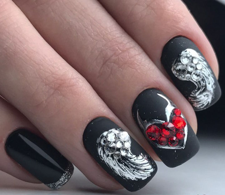 Многие модницы с пренебрежением относятся к черному цвету в маникюре, не используя его даже в повседневном дизайне. Но мы предлагаем пойти на модный эксперимент и сделать черный маникюр на 14 февраля. Но темном, например, матовом фоне шикарно будет смотреться красное сердце с блестящим акцентом.