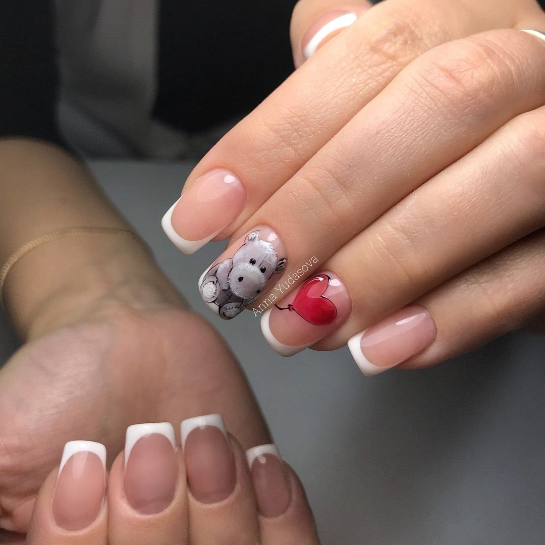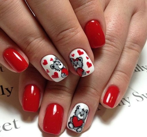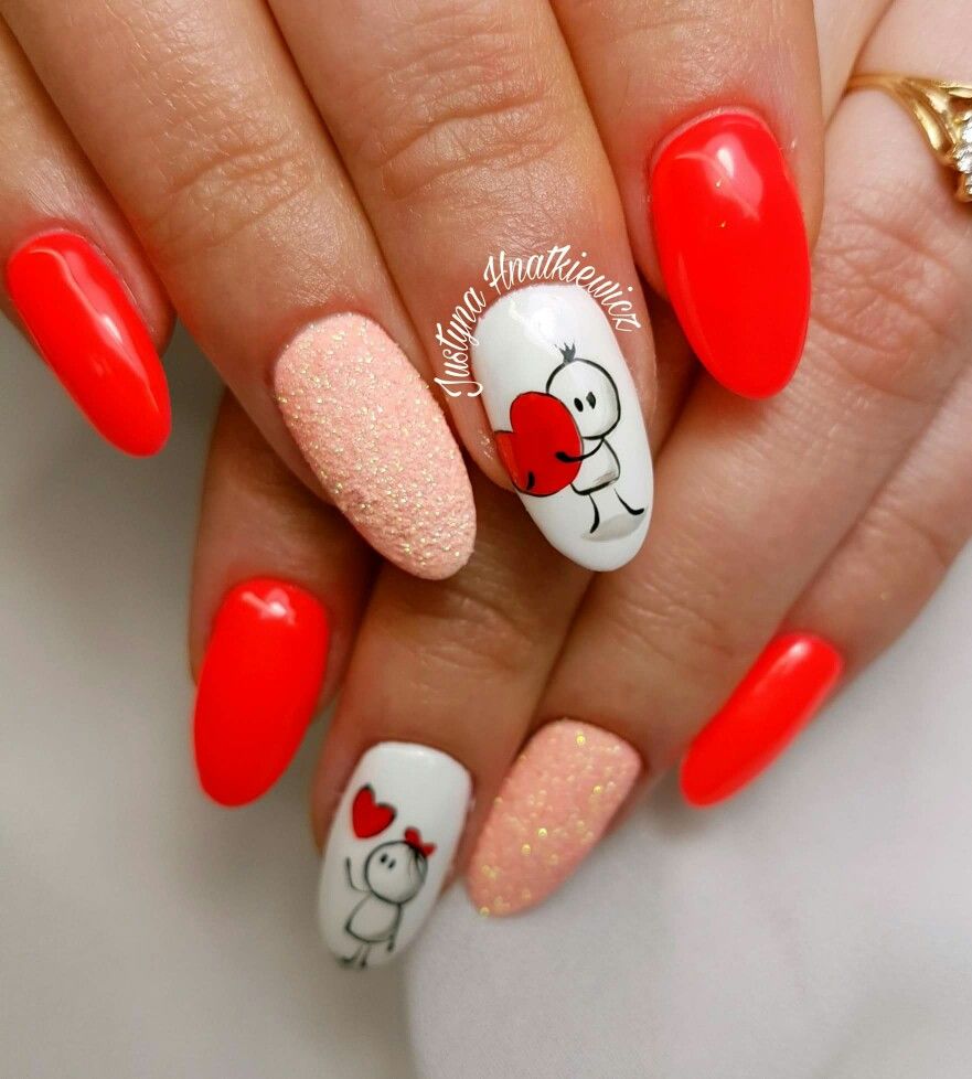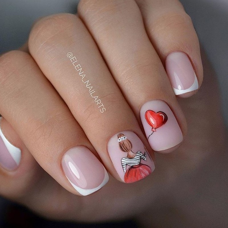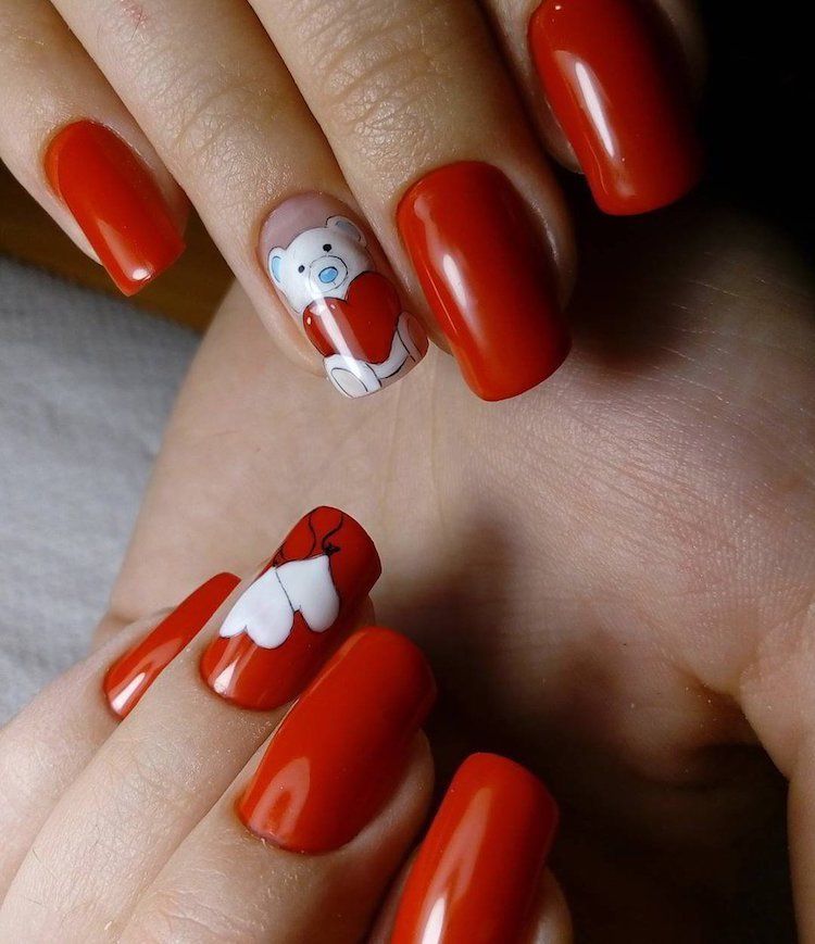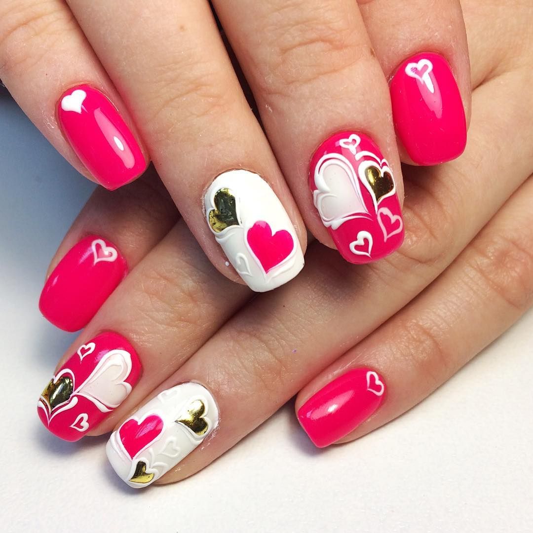Это самый востребованный вариант дизайна ногтей на 14 февраля. И здесь довольно большое поле для фантазии.