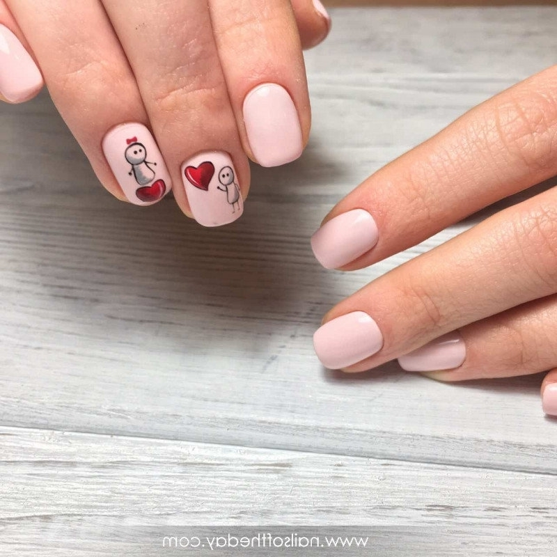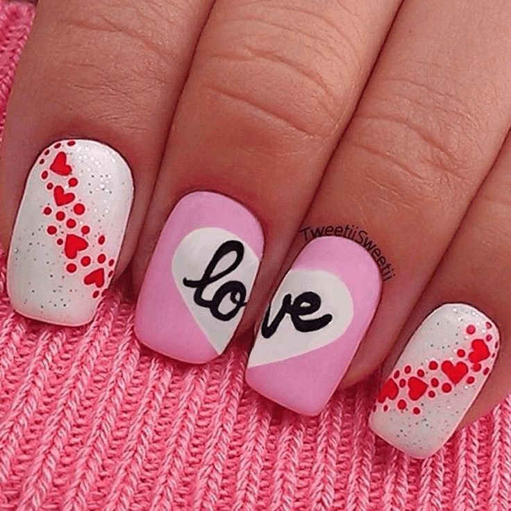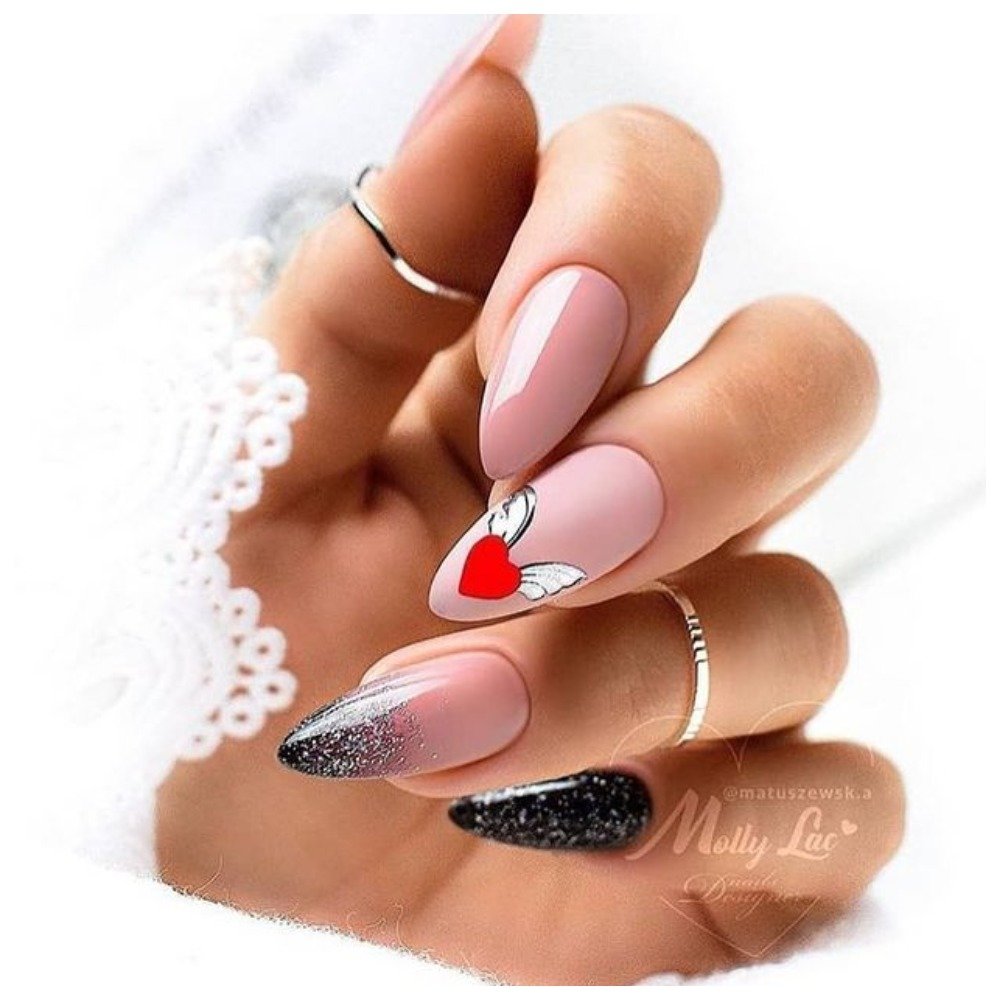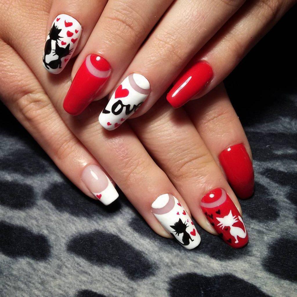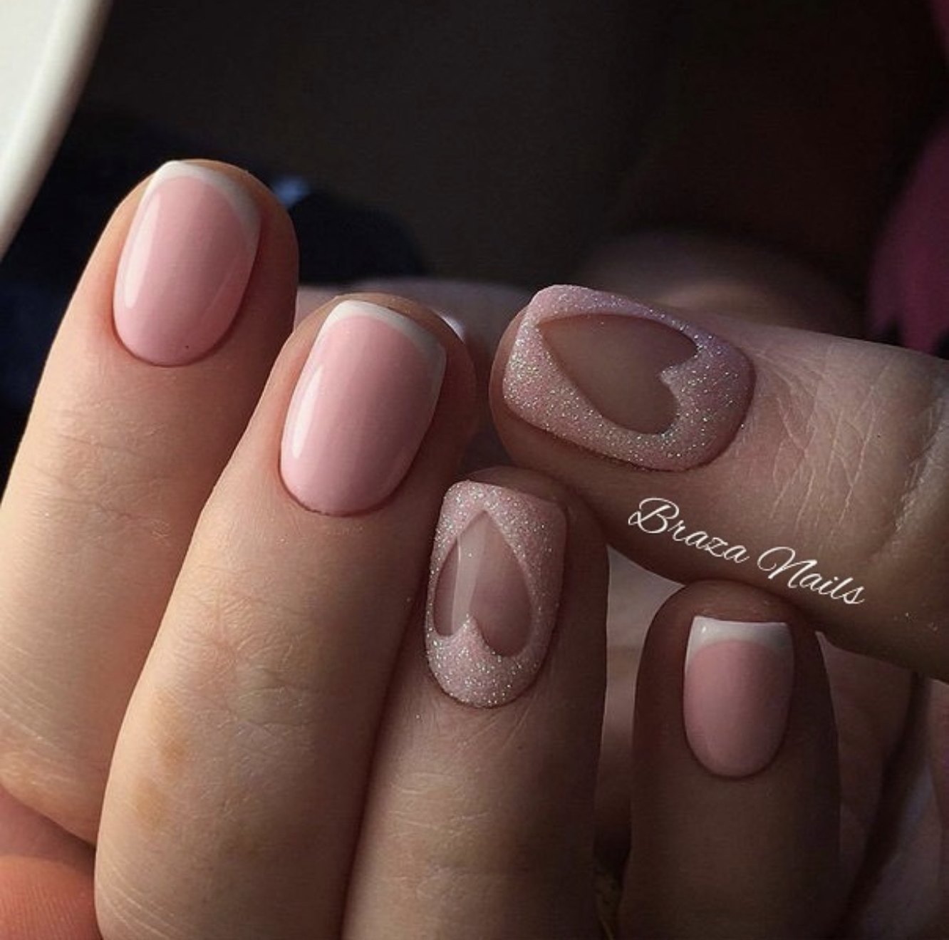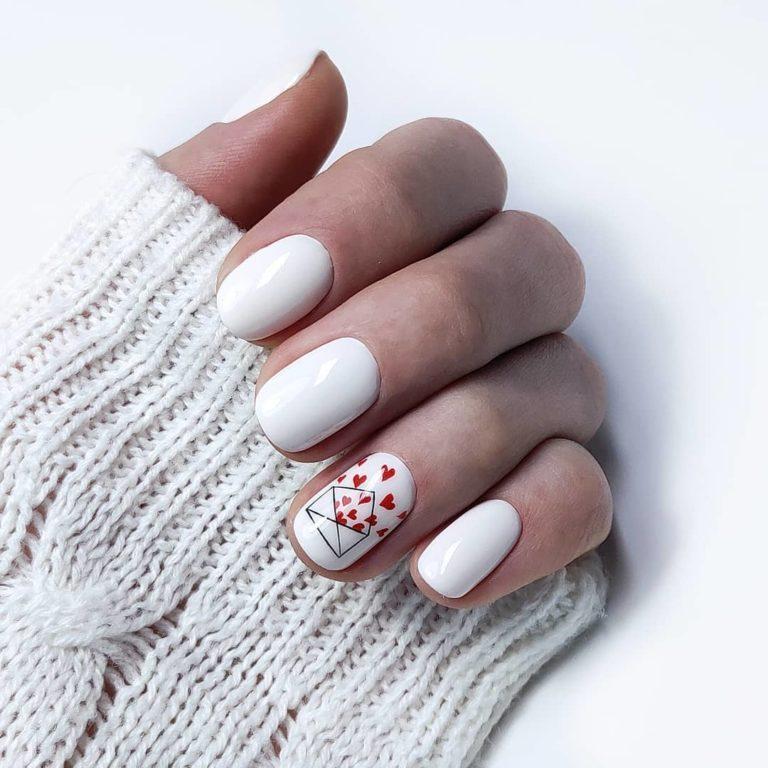 Это самый востребованный вариант дизайна ногтей на 14 февраля. И здесь довольно большое поле для фантазии.