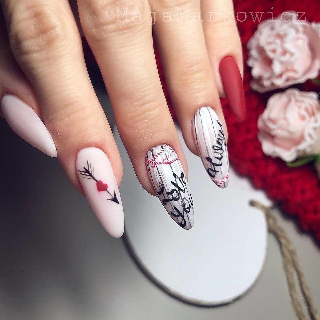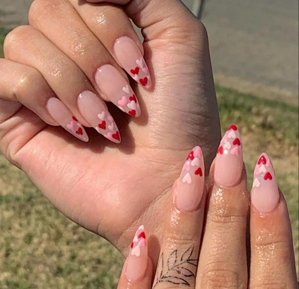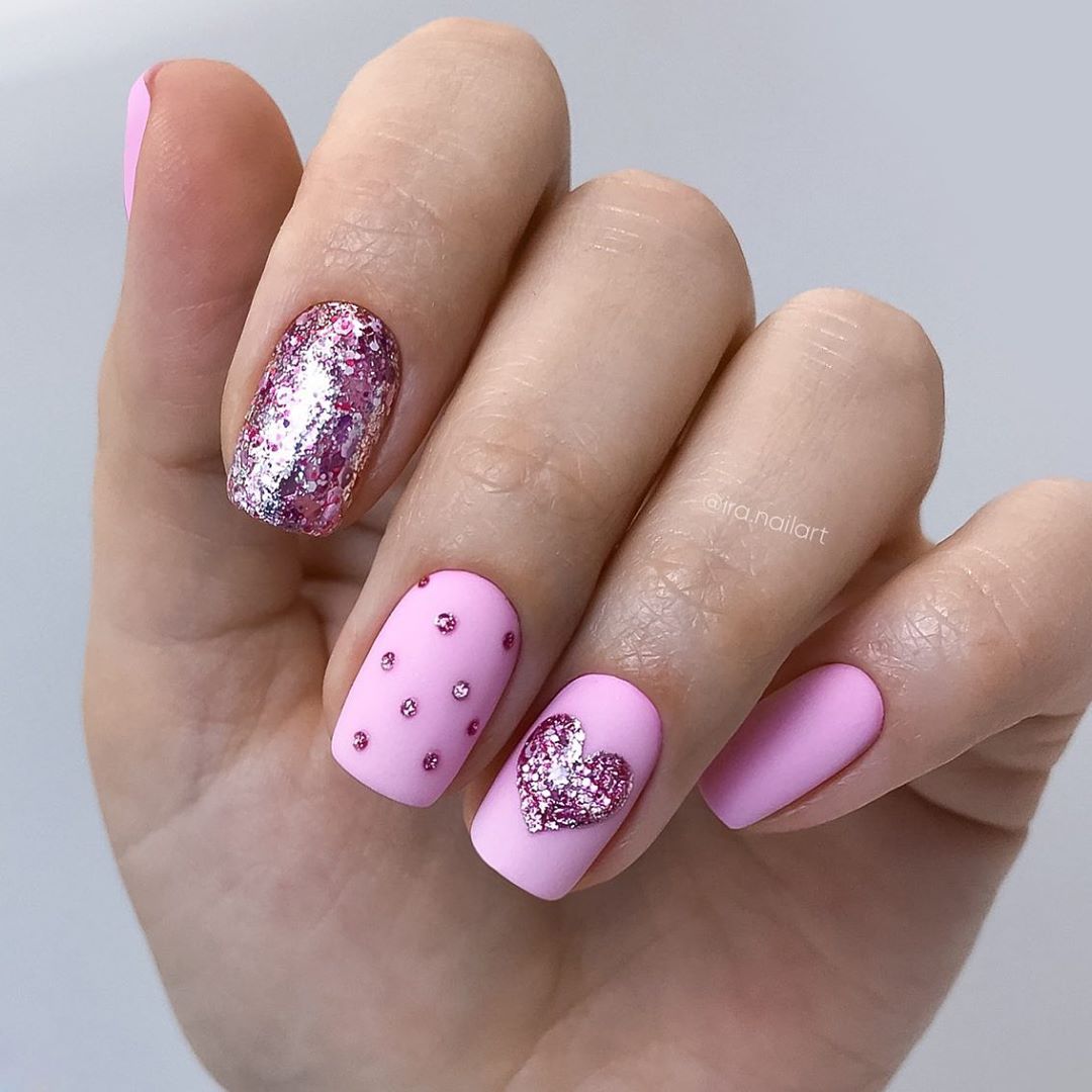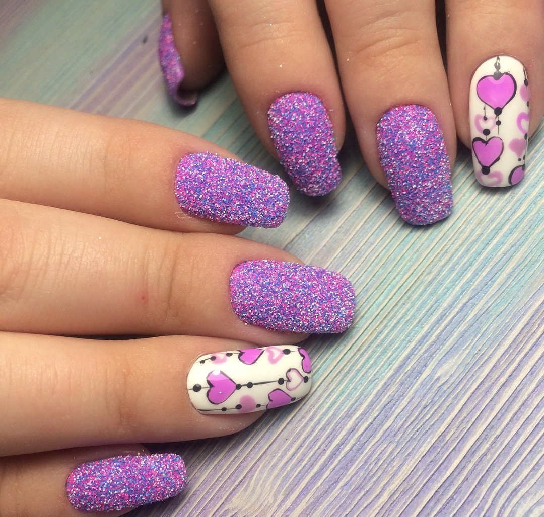 Это самый востребованный вариант дизайна ногтей на 14 февраля. И здесь довольно большое поле для фантазии.
