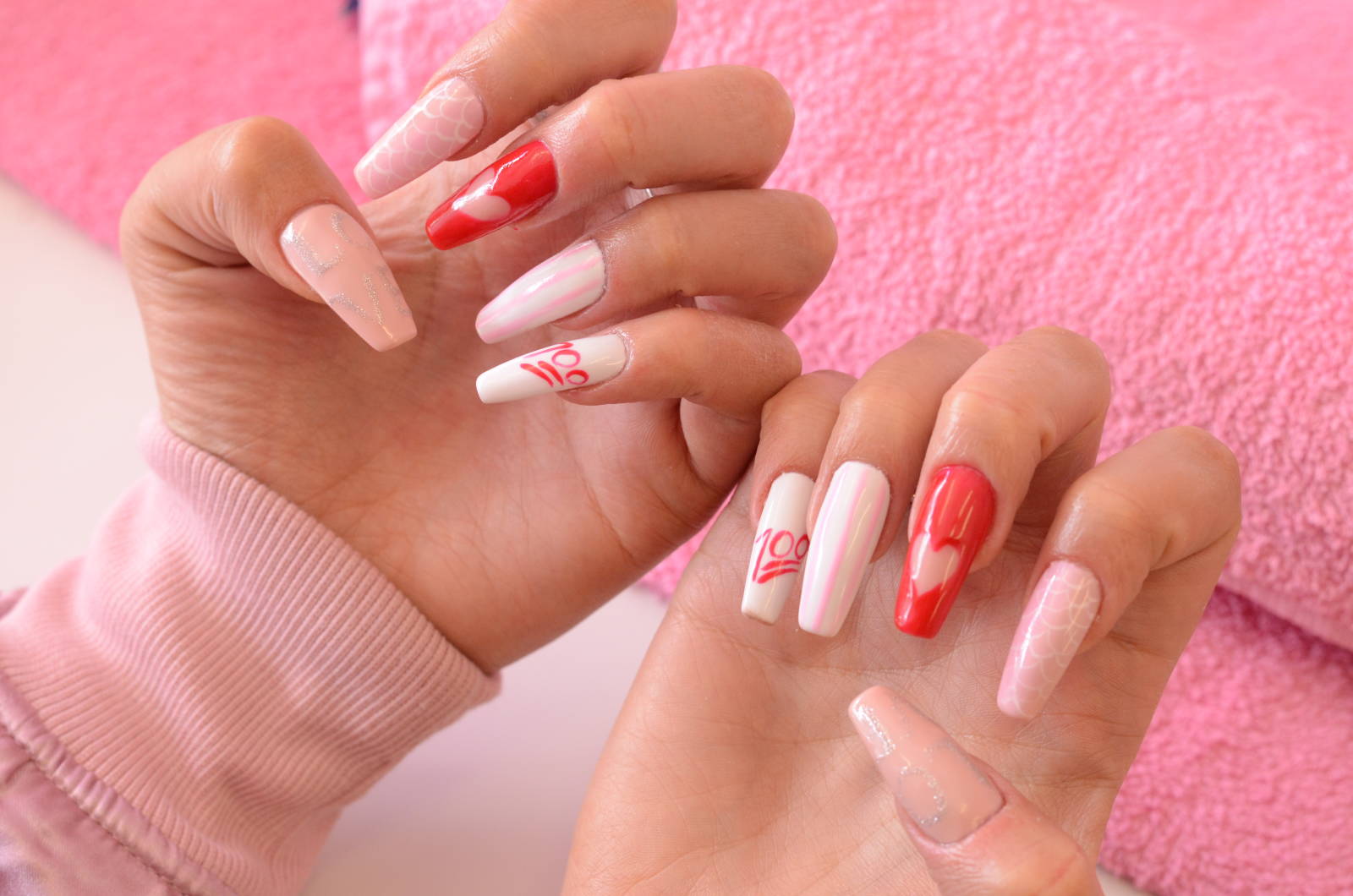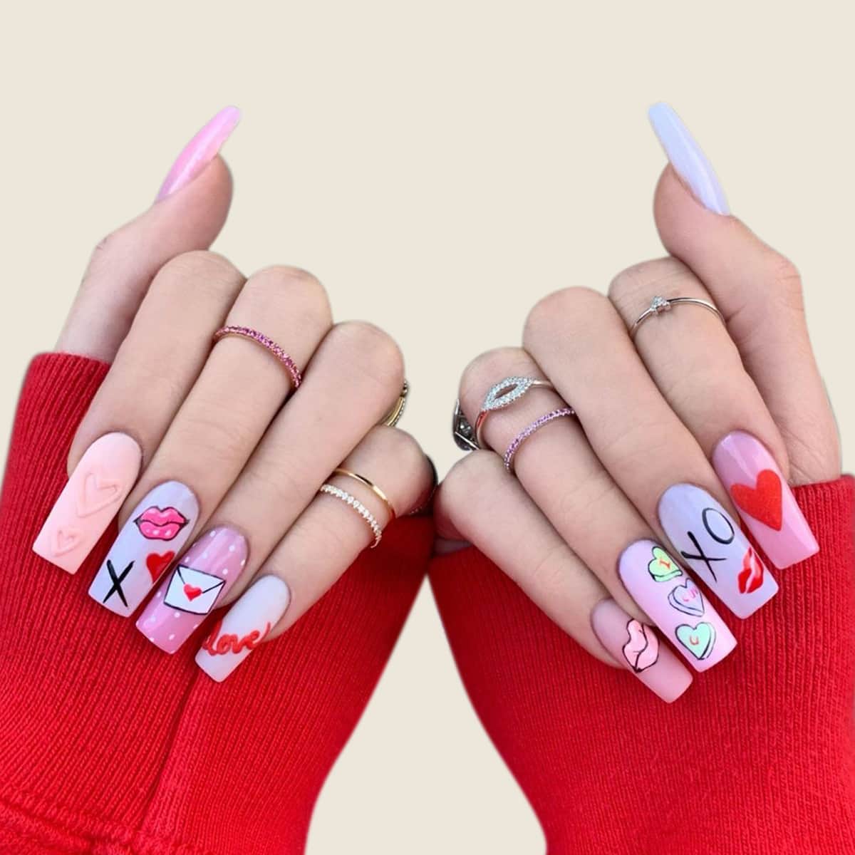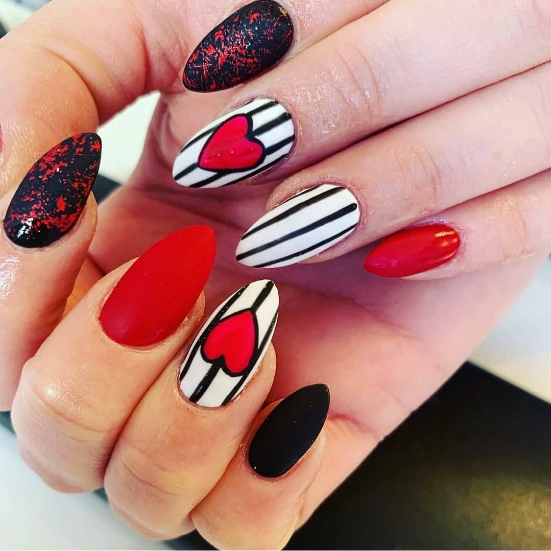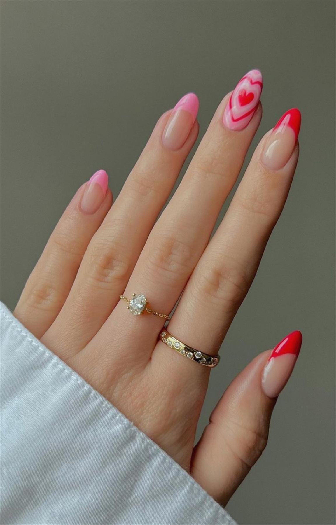 Это самый востребованный вариант дизайна ногтей на 14 февраля. И здесь довольно большое поле для фантазии.