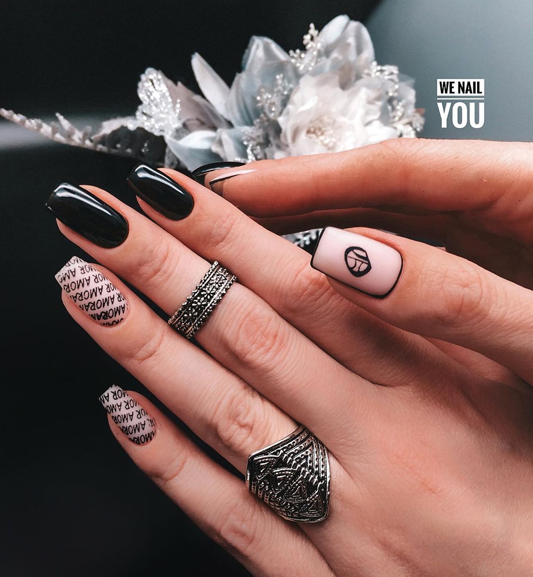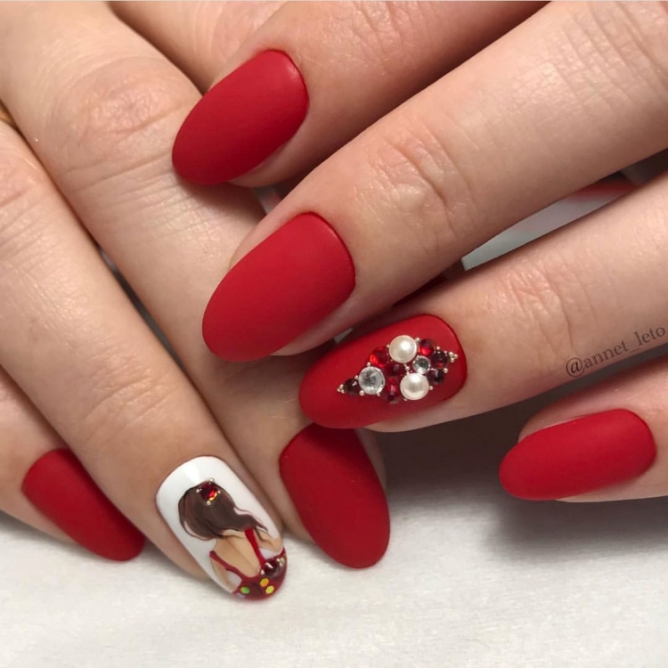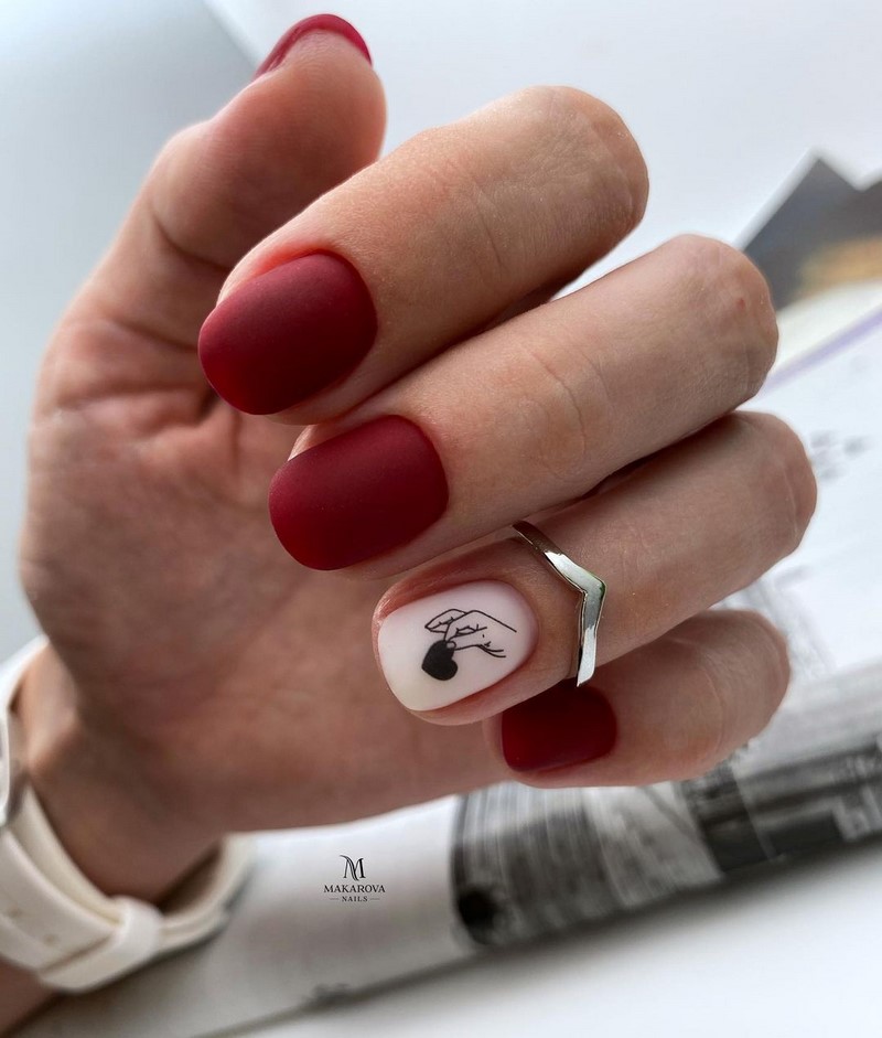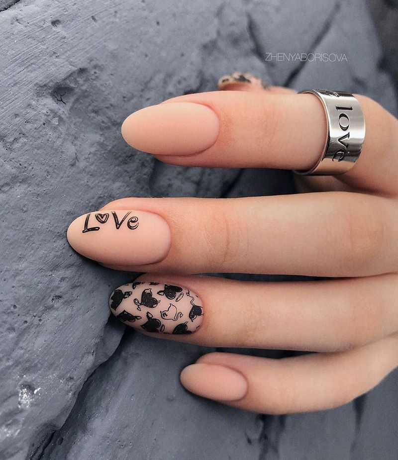 Бархатистую текстуру ноготкам придают с помощью специальных гель-лаков. На такой базе отлично смотрится любой рисунок, фольгированные элементы, надписи и глиттер. Алый, черный, молочный матовые оттенки хорошо сочетаются с наклейками в романтической тематике.