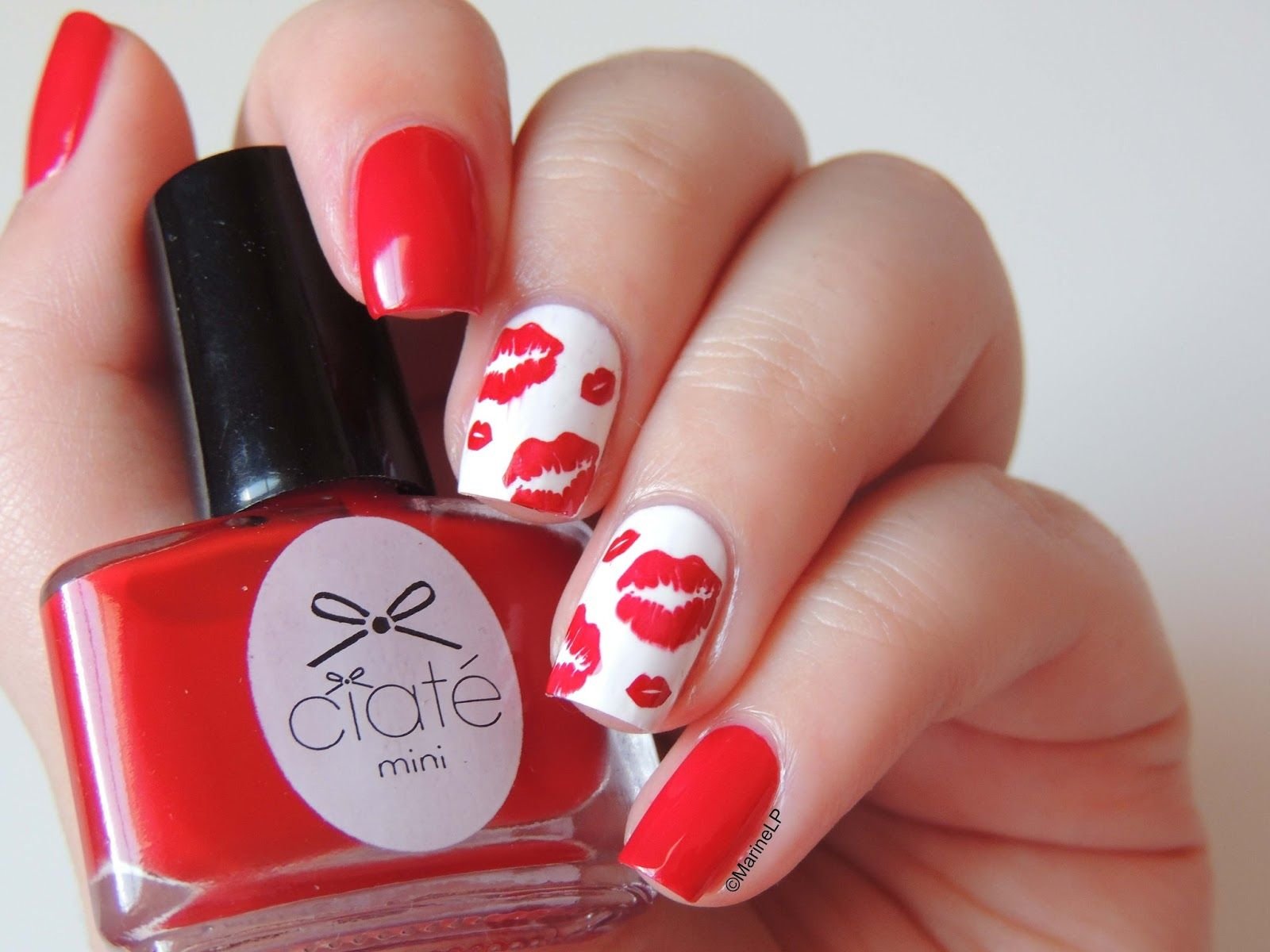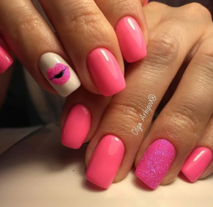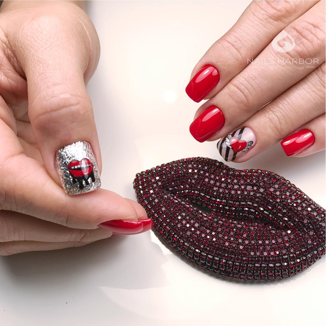 Что еще ассоциируется с 14 февраля, кроме сердечек. Конечно, поцелуи! Пофантазируйте и нарисуйте целую картину на ногтях или просто оформите их в стиле минимализм со следами от поцелуя. Кстати, такой дизайн очень стильно смотрится на темной базе. Также можно разместить призыв для своего партнера на рисунке — «Kiss me» и он сразу поймет, что вы настроены на романтический лад.