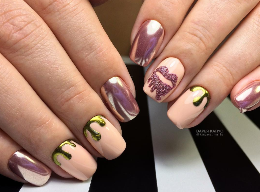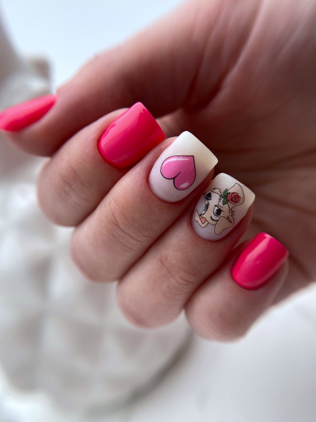 Сердечко совсем не обязательно должно быть одиночны акцентом. Его можно совместить с абстракцией, геометрией, дорисовать силуэта влюбленных. Например, мило смотрится дизайн с воздушными поцелуями или пушистыми собачками. Помните, что рисунком женщина может выразить то, что не решается или просто не может описать словами. А нейл-арт прекрасно поможет в этом.