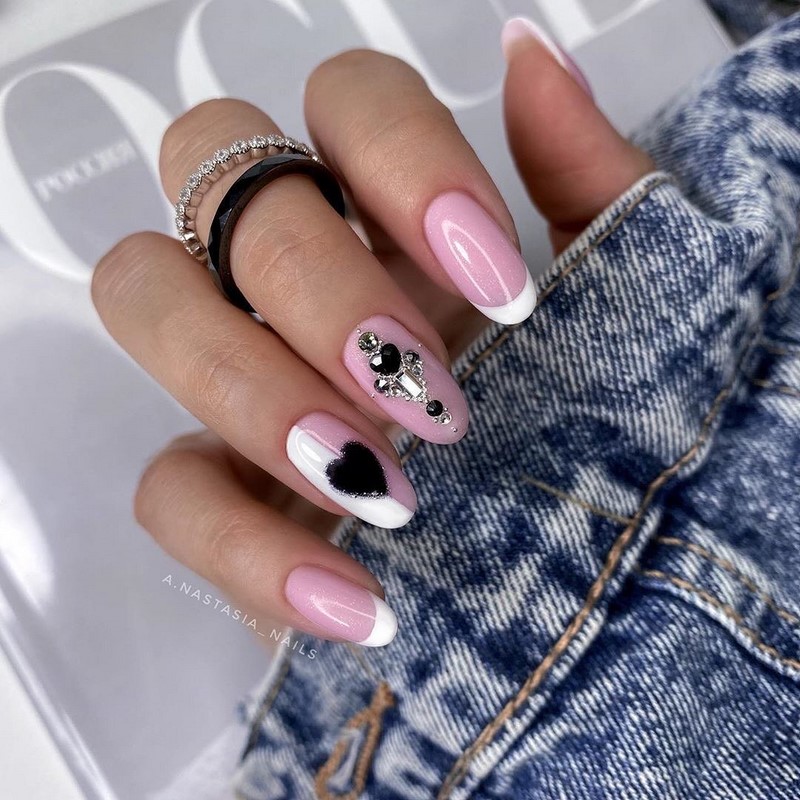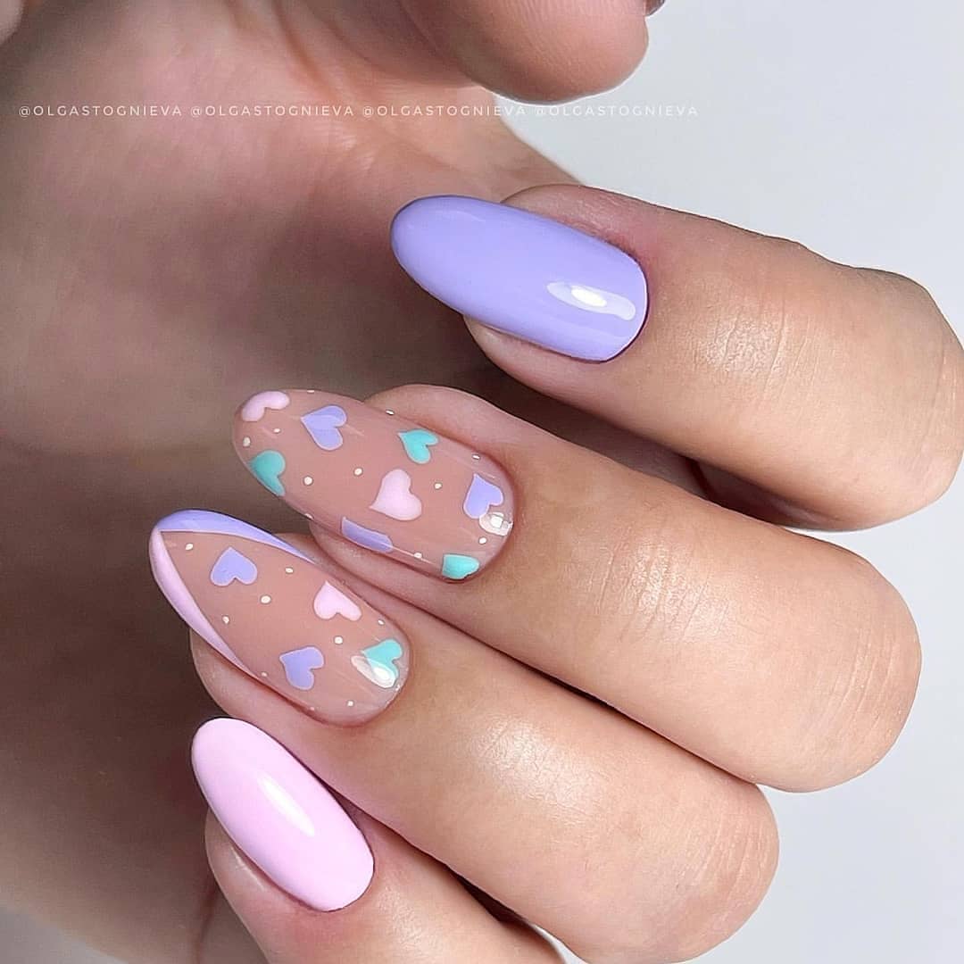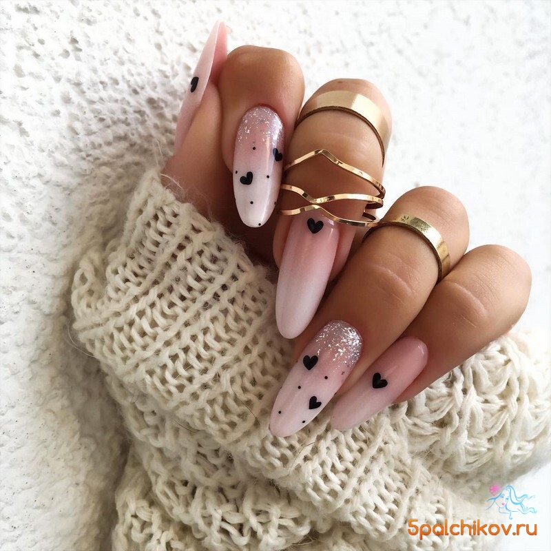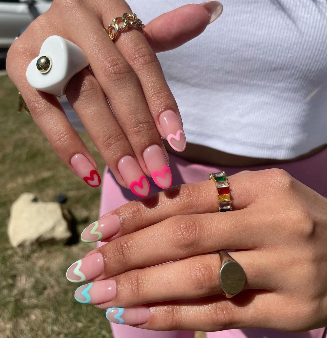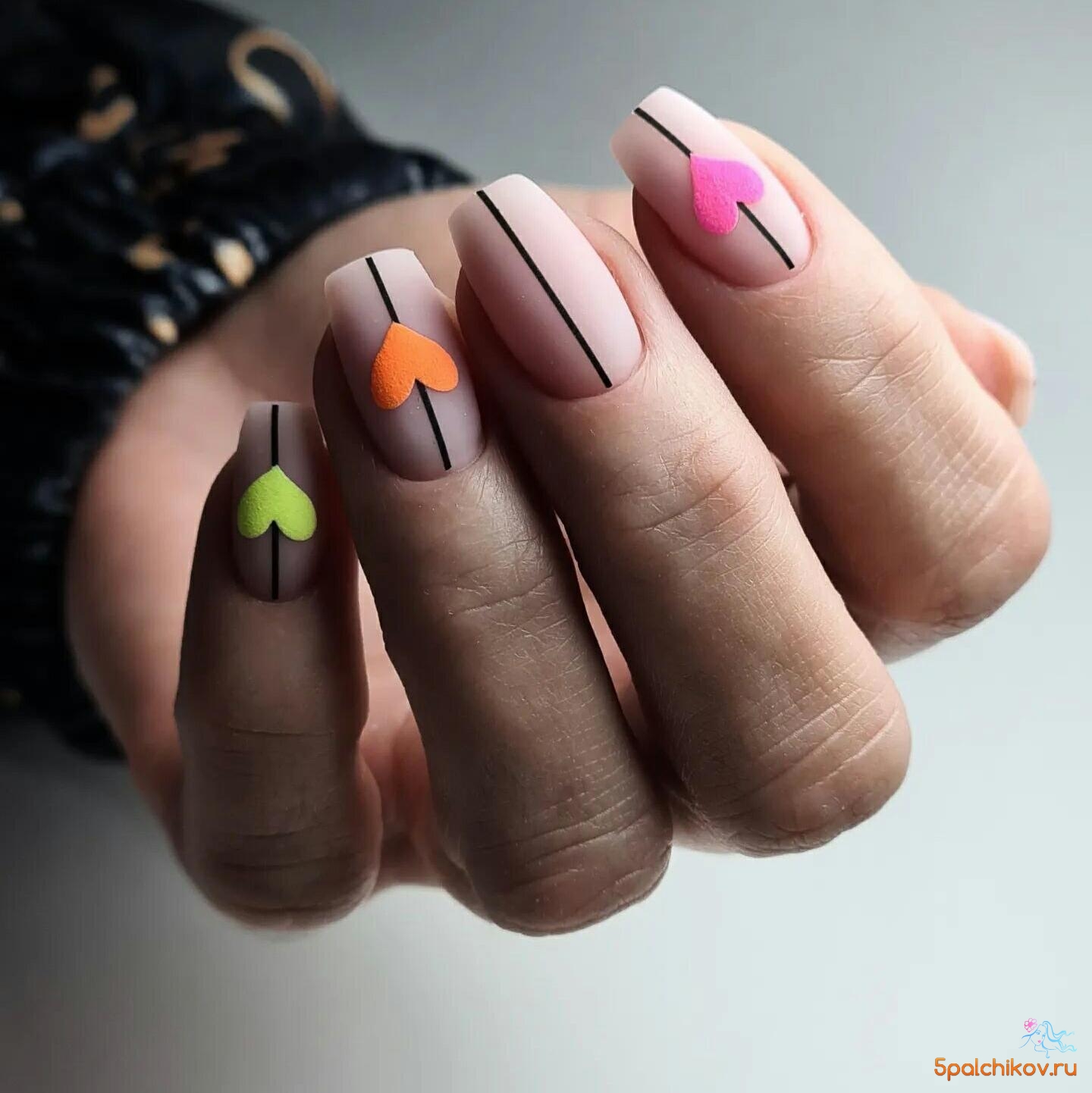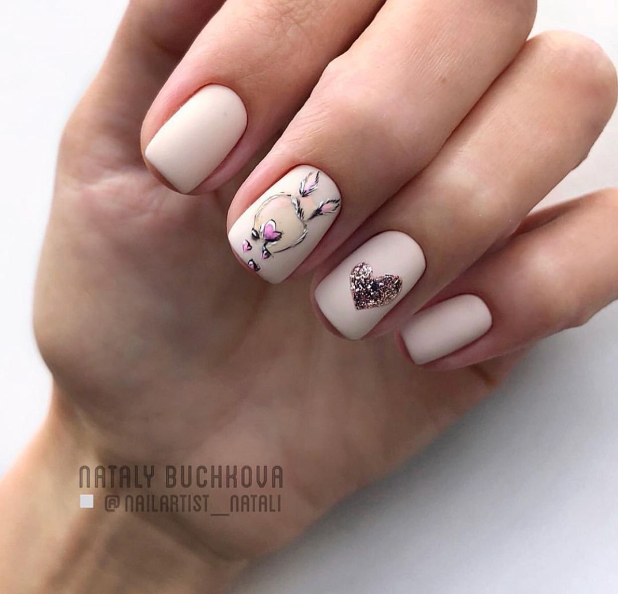 Совет: интересный вариант — выделить сердечками зону лунки пластины. Получится привлекательный дизайн, а если сделать сердечки разного цвета, то еще и очень стильным. Кроме того, такой нейл-арт впишется в любой образ и стиль. Для базы выбирайте пастельные, нюдовые оттенки или молочную базу.