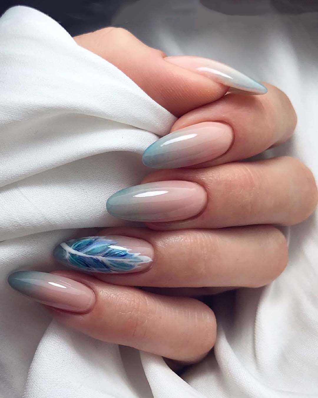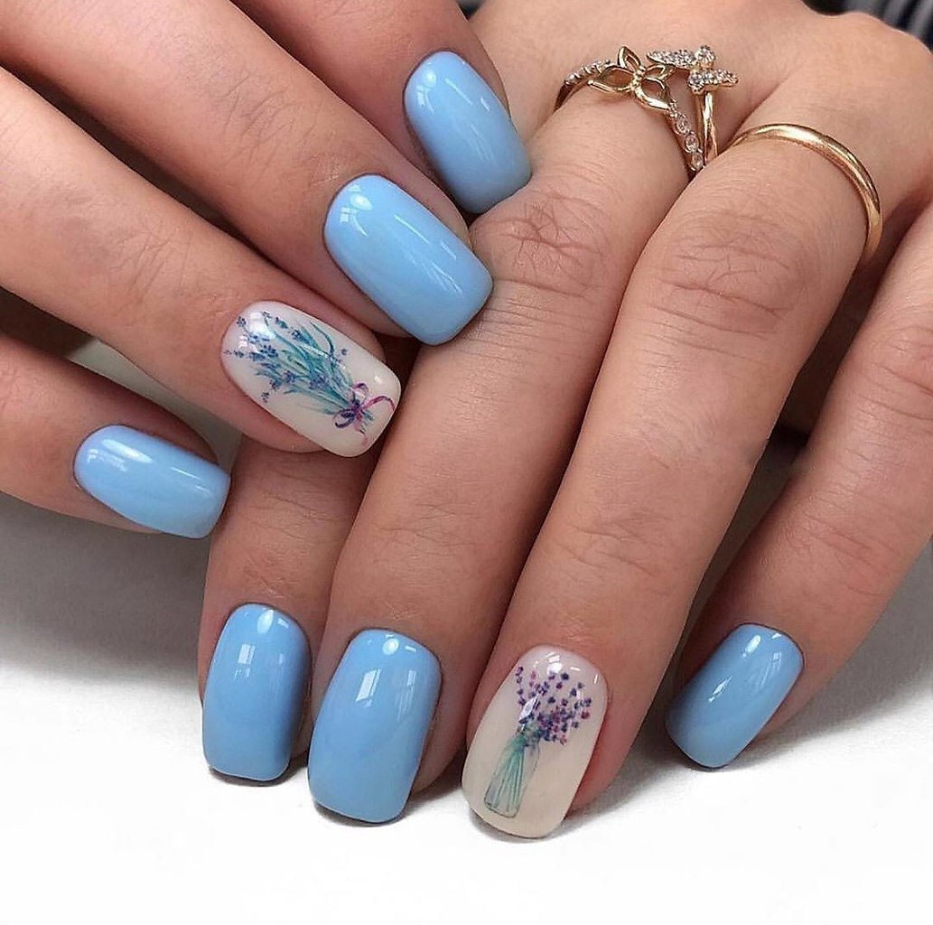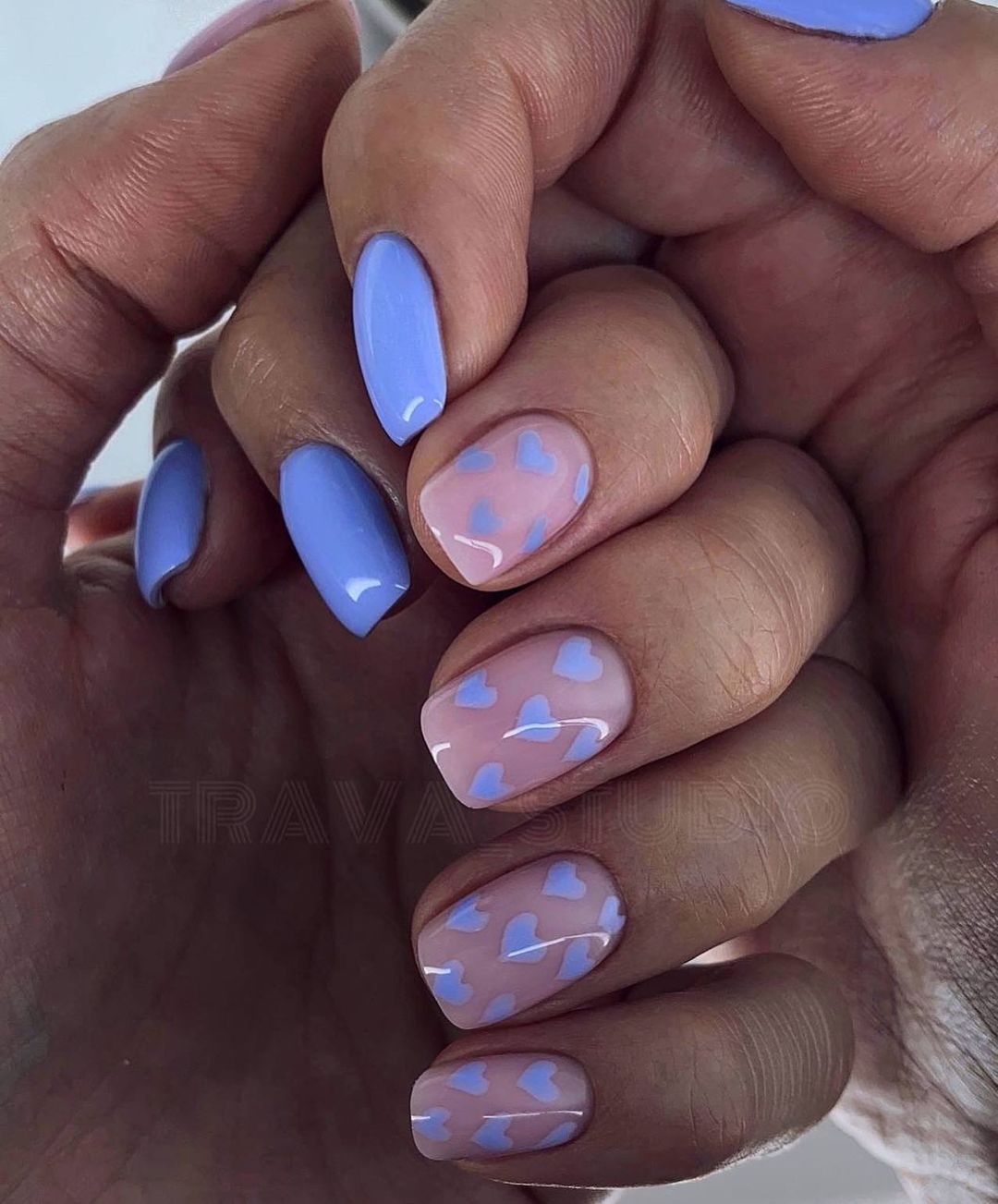 Еще один романтичный и красивый оттенок. Холодные тона подойдут платиновым блондинкам. Но голубом фоне эффектно смотрится серебристый дизайн — рисунки, фольга и др.