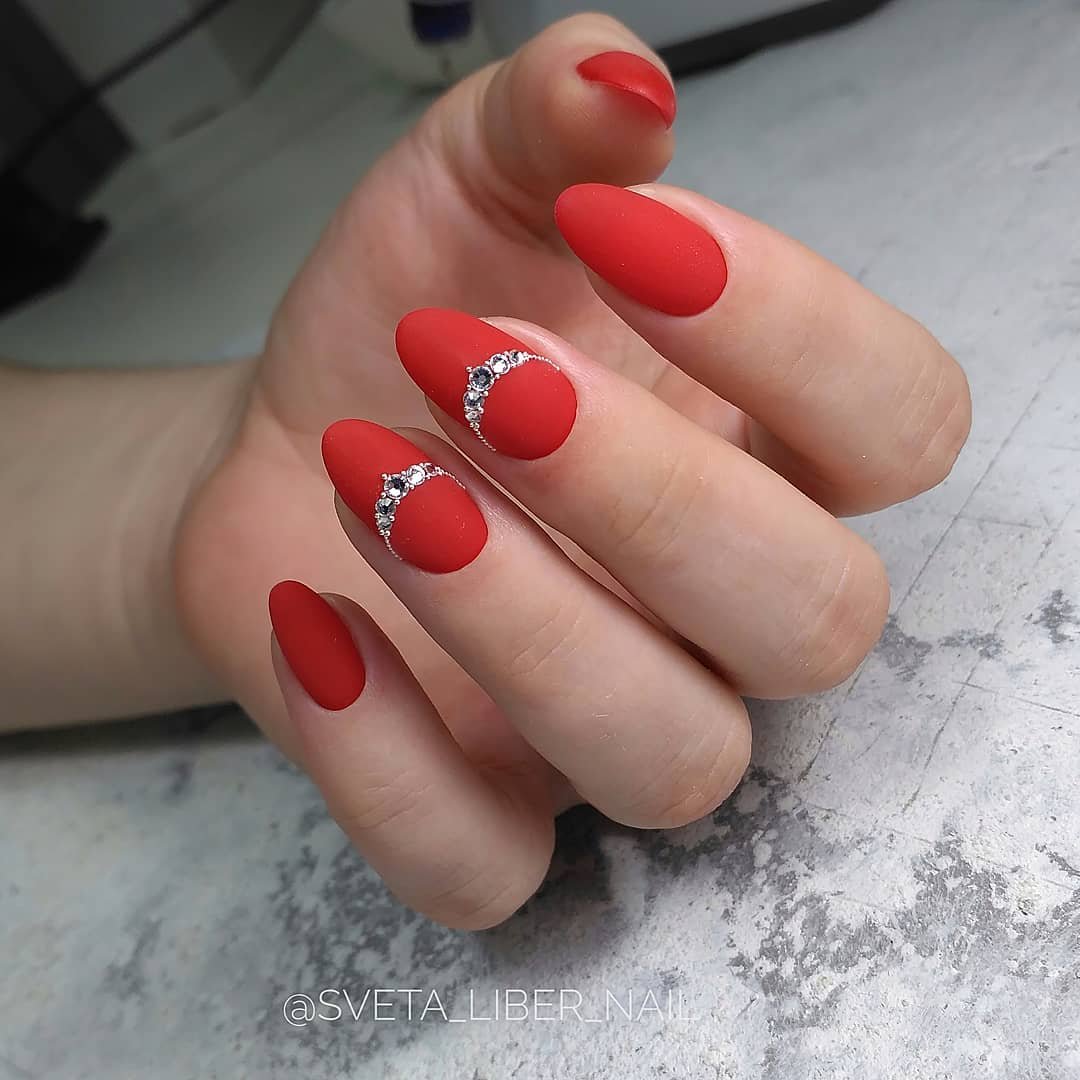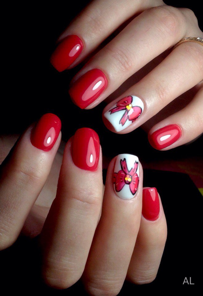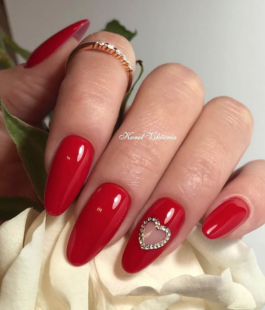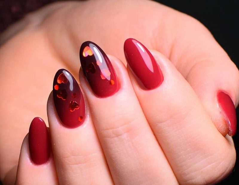 Вся палитра красного востребована в День всех Влюбленных. По умолчанию это цвет страсти и пылкого отношения друг у другу. палитра красного очень богата. Необязательно выбирать алые оттенки, отдайте предпочтение бордо, вишневому, марсала и др. И такой маникюр будет не менее праздничным.