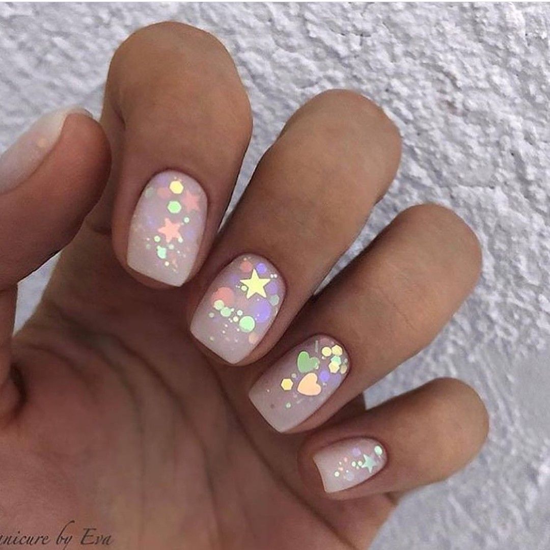 Этот вариант декора снова вырывается в лидеры праздничного маникюра. Конфетти модницы использовали для создания новогоднего маникюра, не станет исключением и 14 февраля. Обязательно формате платину этими фольгированными кружочками. Кстати, в 2026 году мастера рекомендуют использовать маленький размер конфетти для ногтей.