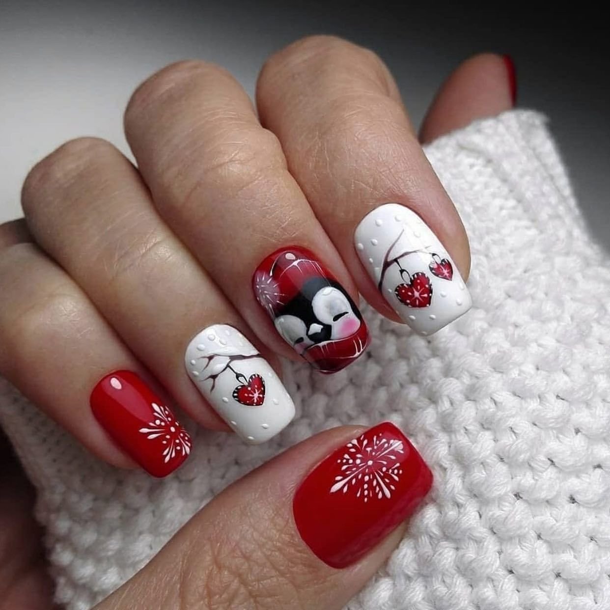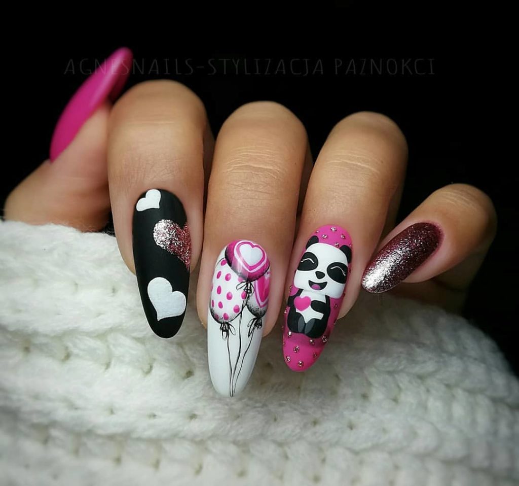 Почему бы не создать романтический маникюр на 14 февраля с молодыми влюбленными животными. Это могут быть мягкие игрушки или реальные животные — лисы, панды, коалы, фламинго, лебеди и даже динозаврики. Если хочется чего-то необычного, попросите мастера нарисовать волка и волчицу, которые вместе воют на Луну. Такой дизайн отлично подойдет для длинных миндалевидных ногтей.
