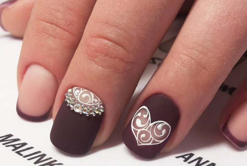 Это, конечно, классика, но на 14 февраля французский маникюр стоит не на первом месте. Тем не менее это хороший вариант для праздничного нейл-арта. Можно взять за основу базовый вариант френча с белой улыбкой и дополнить его сердечком из страз. А можно сделать необычный френч, оформив платину или лунку тематическим рисунком. Да даже обычный френч без дополнительного декора, но в розовом или красном цвете, будет праздничным.