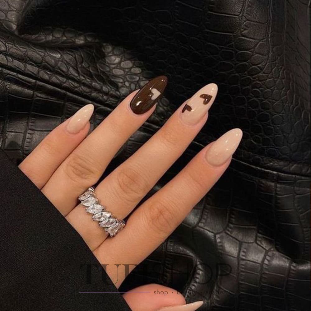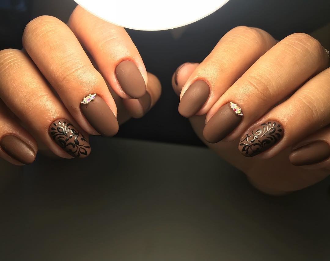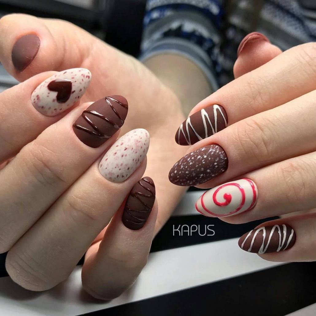 Коричневая гамма все более актуальна в 2026 году. Выбирайте насыщенный оттенок горького шоколада или мягкий молочного. Дополняйте блестящим ярким дизайном и ваш образ на 14 февраля готов.