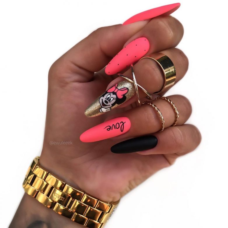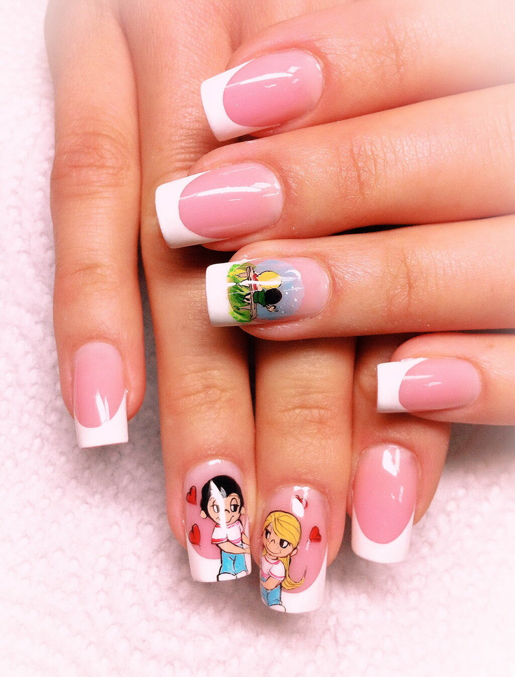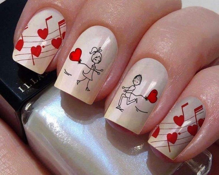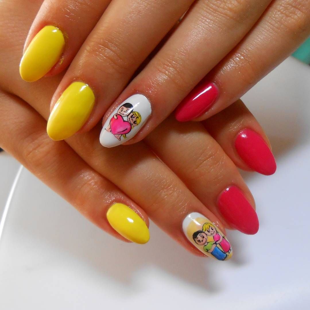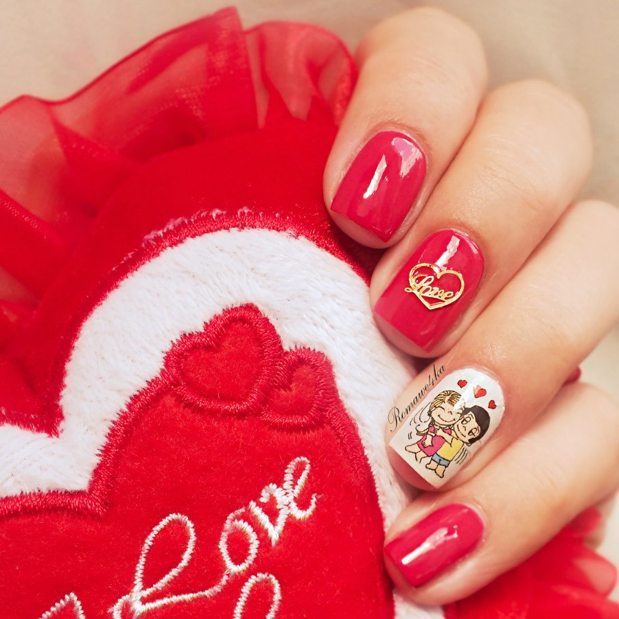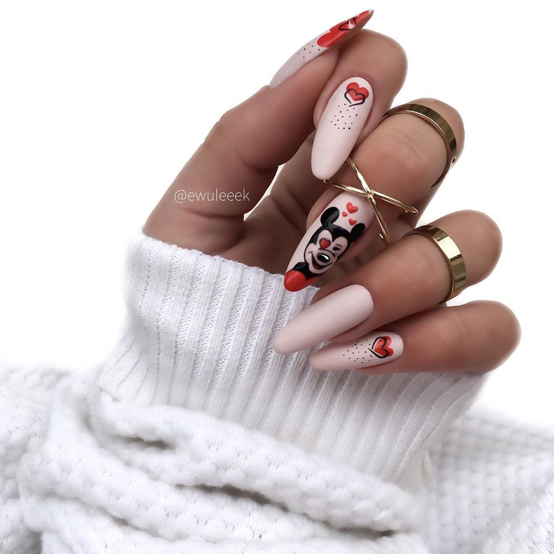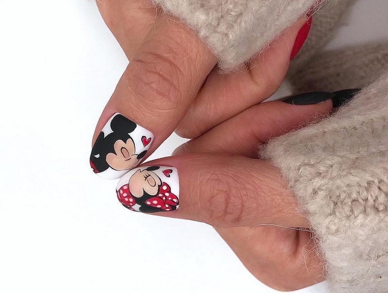 Совет: можно использовать образы мультяшных парочек — Микки и Минни, Дональд и Дейзи, Моряк Папай и Оливия и др. Если вам хочется привнести в дизайн ногтей на 14 февраля немного юмора, выбирайте нестандартные «парочки». Например, мышь Рокфор и сыр, Папай и шпинат и др. И это необязательно должны быть мультяшные пары. Например, пицца и баночка пива — это тоже пара, которую сложно представить друг без друга. Если ваш молодой человек сможет оценить такую шутку, обязательно сделайте подобный маникюр.