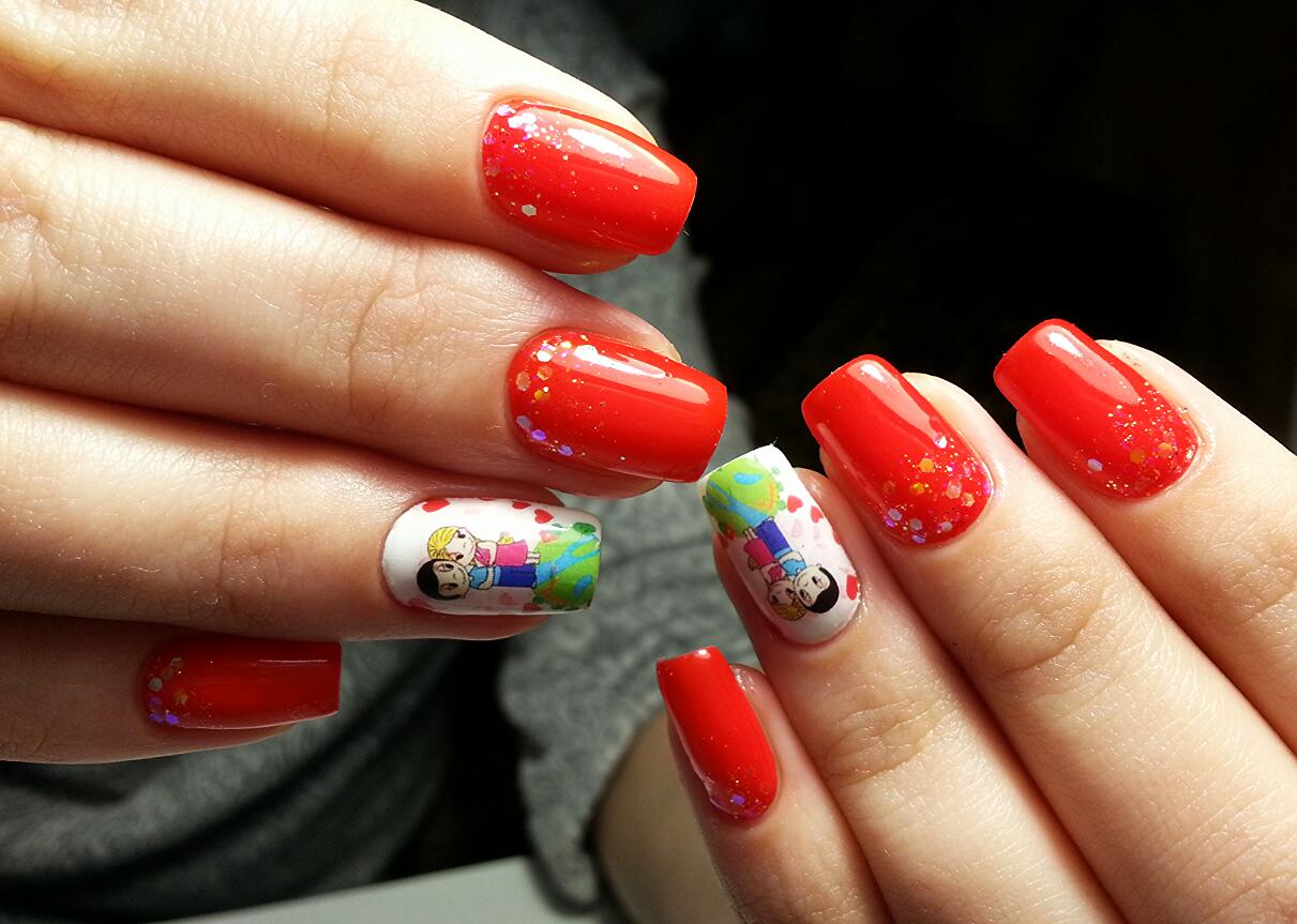 Рисунки на ногтях — довольно трудоемкий дизайн. Современный нейл-арт предлагает модницам много способов создать уникальный дизайн ногтей. Наклейки тому пример. Выбирайте тематические слайдеры. Очень популярны на 14 февраля наклейки в стиле «Love is…». Выделите таким образом один пальчик, не стоит забивать подобными картинками все ногти. такой маникюр будет выглядеть чрезмерным.