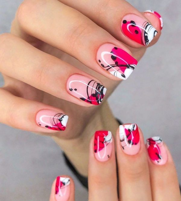 Думаете такой дизайн не подходит для 14 февраля. Ошибаетесь — абстрактный рисунок можно создать с помощью запутанных линий, в которых легко угадываются сердечки. Да и просто яркая страстная абстракция вполне подходит для создания праздничного маникюра к Дню святого Валентина.