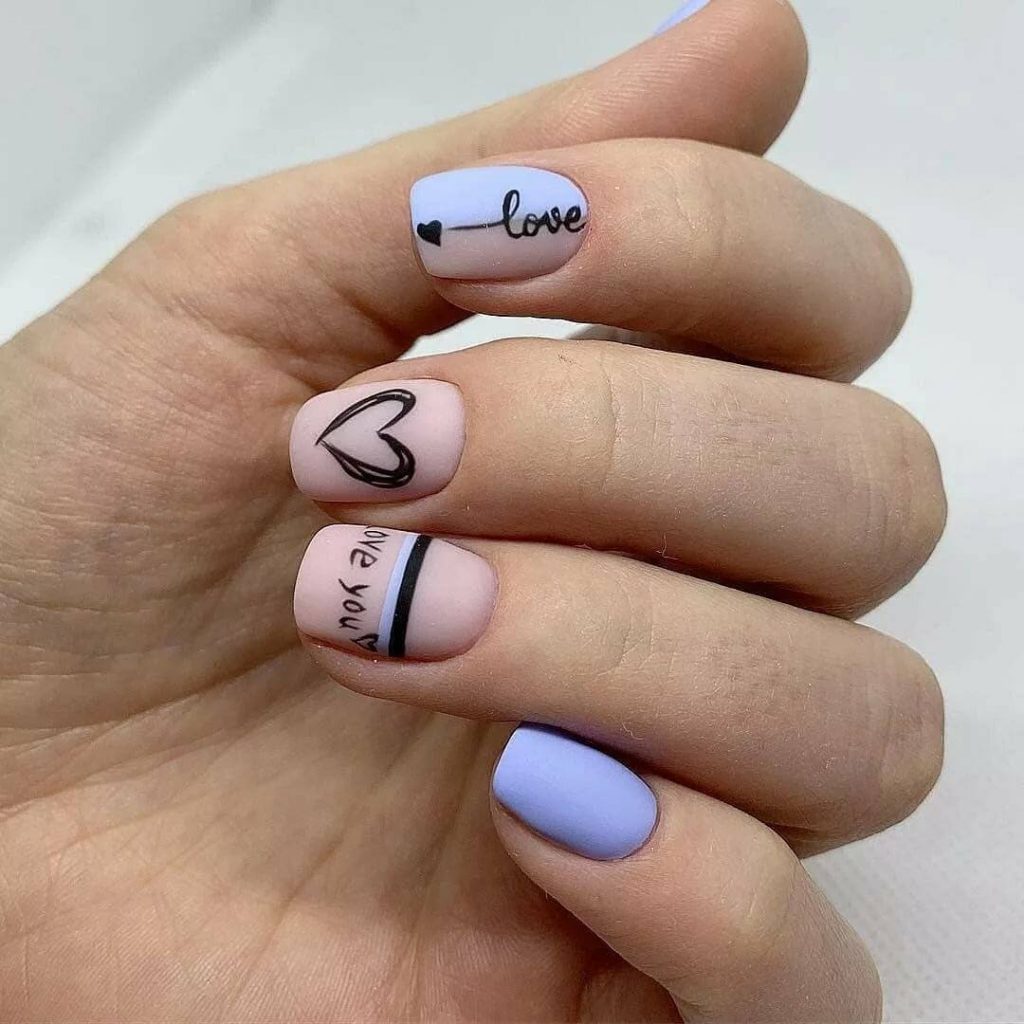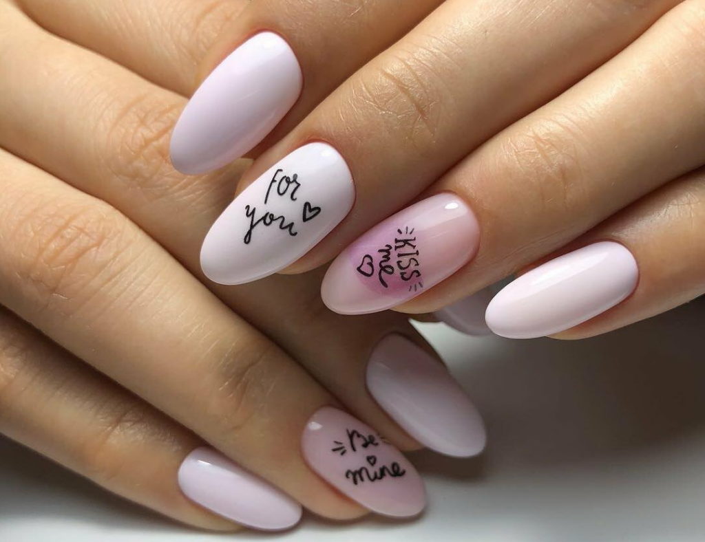 Что написать на ногтях 14 февраля? Конечно слово «любовь», ведь именно ей и посвящен праздник. Выбирайте любой язык — даже самый необычный. Кроме этого слова можно написать имя возлюбленного или любовную формулу: например, «Катя+Иван=любовь».