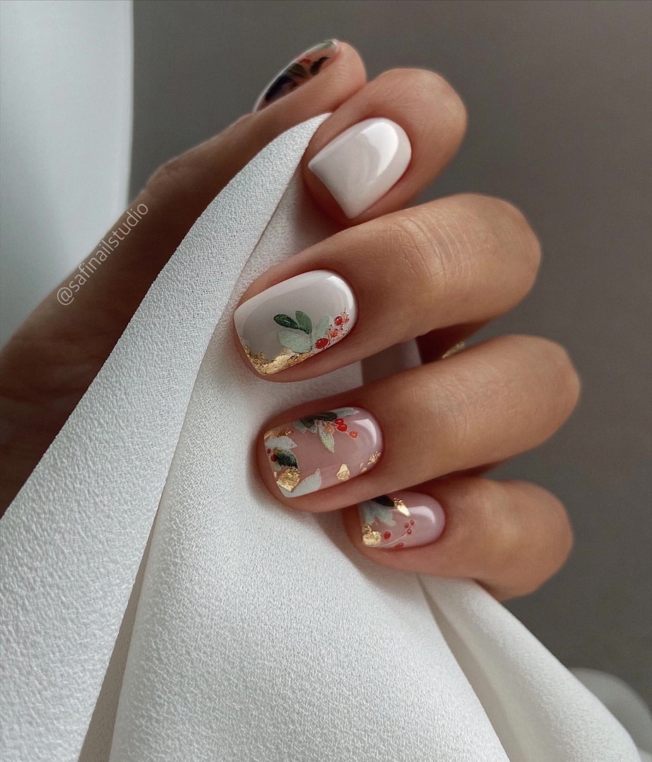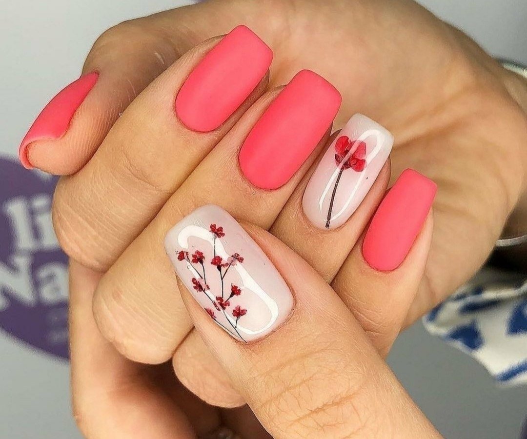 Выделим этот вариант в отдельную группу. Почему дизайн ногтей на 14 февраля должен быть только с сердечками и поцелуями? Цветы — не менее важный атрибут этого зимнего праздника. Мастера все чаще предлагают своим клиентам сделать цветочный маникюр зимой 2026 года. Но основной тренд — это мелкие цветочки на густом фоне, которые напоминают гобелены. Отлично смотрятся варианты дизайна с нежными пушистыми пионами или графичными веточками трав.