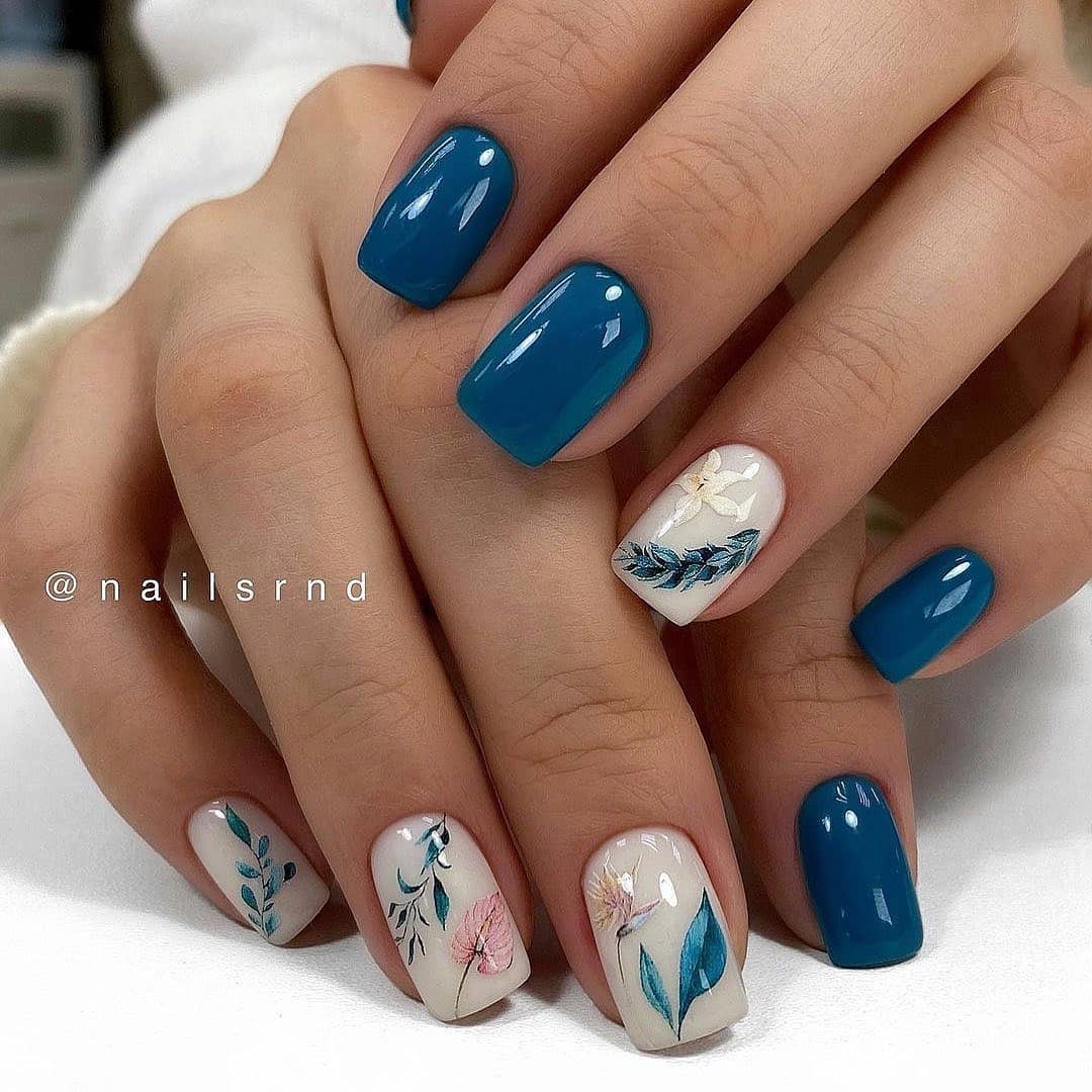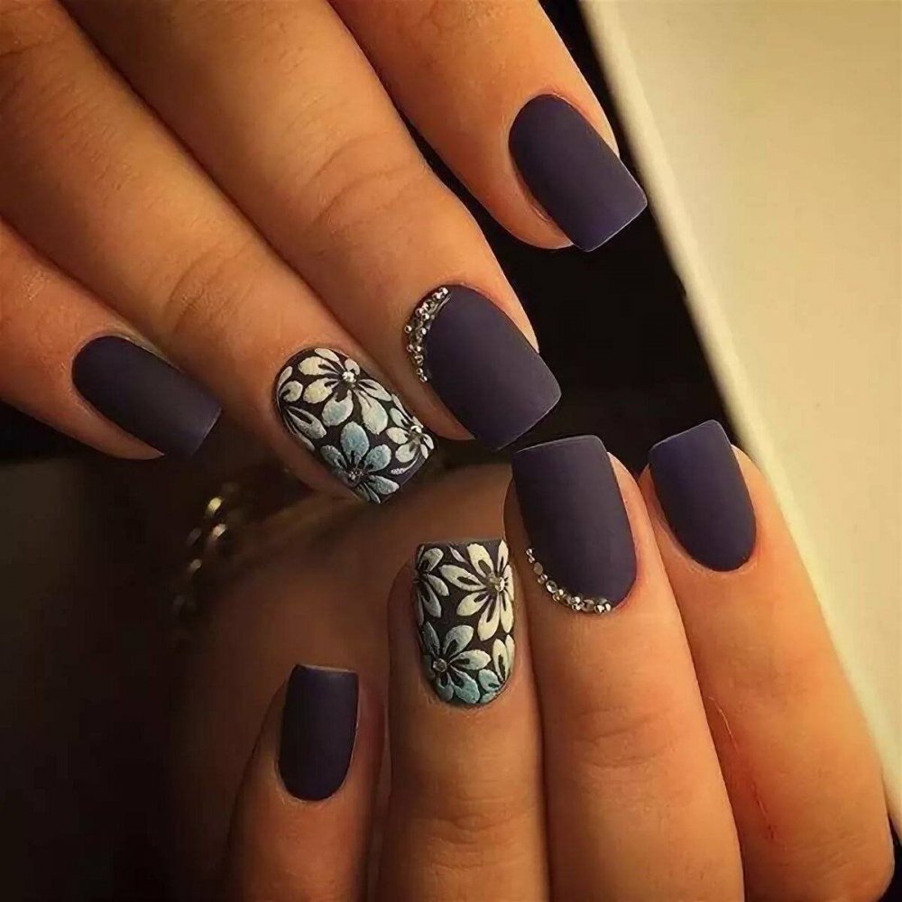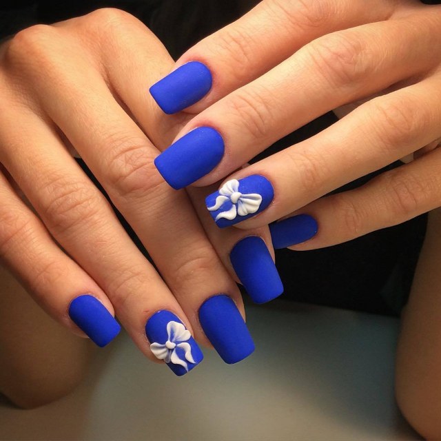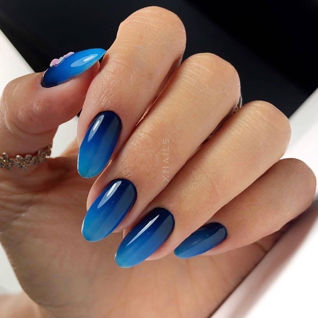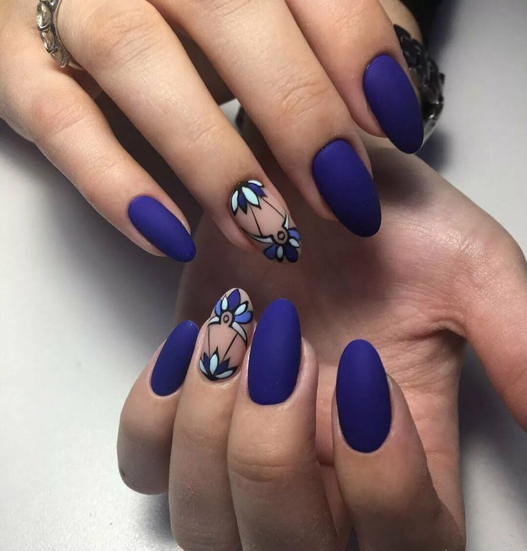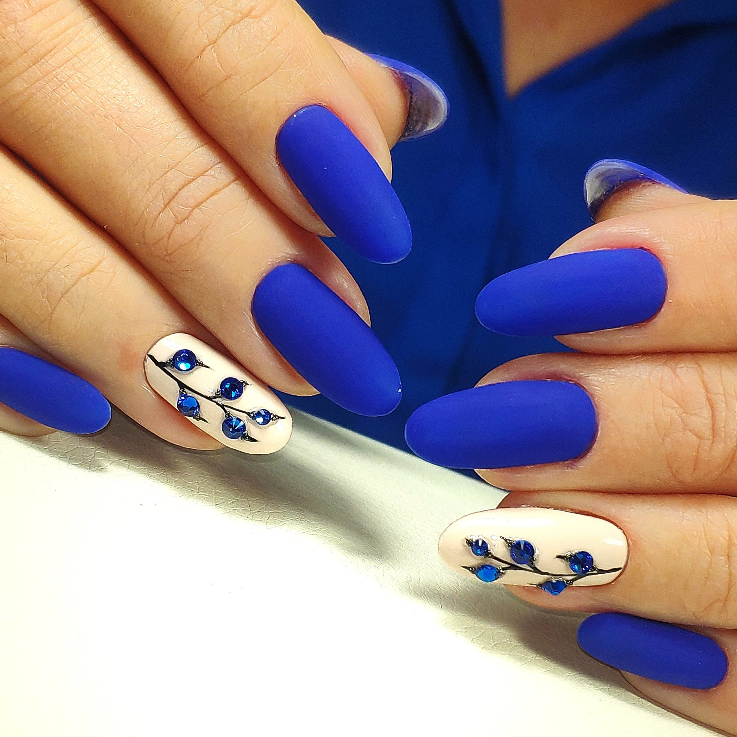 Не стоит забывать и о сочных оттенках синей палитры. Такие цвета больше подойдут взрослым и состоявшимся дамам. Эффектно смотрится на таких ногтях дизайн золотого оттенка.