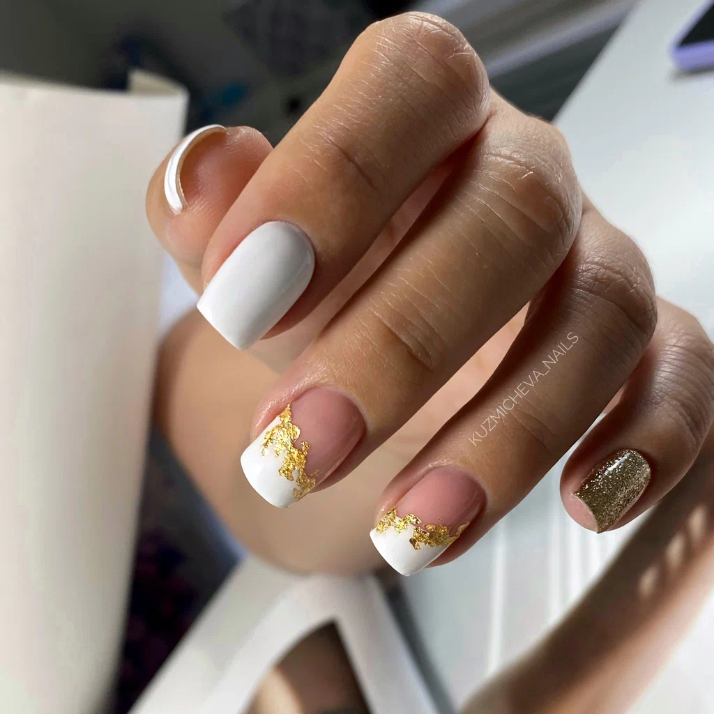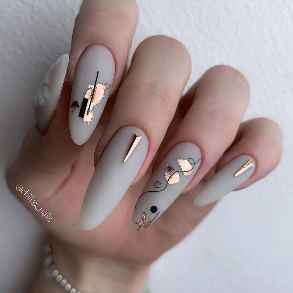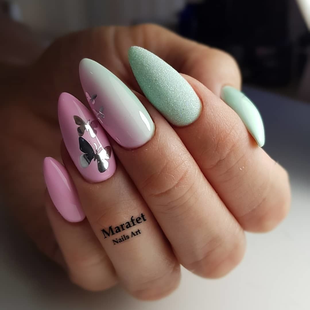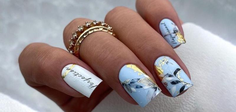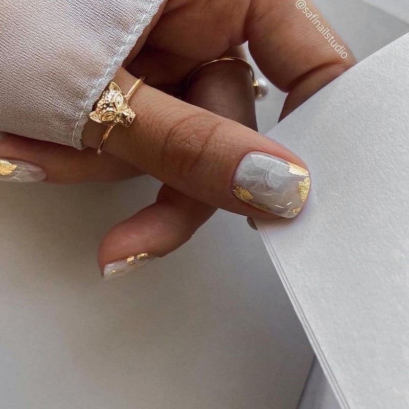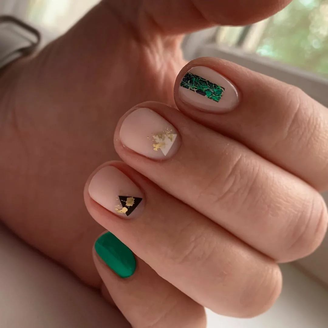 Если вам нужно добавить блестящий акцент стоит выбрать фольгу. Она может использоваться как подложка или как хаотичные акценты. Чем неаккуратнее будут разбросаны фольгированные кусочки на ногтях, тем интереснее и актуальнее.