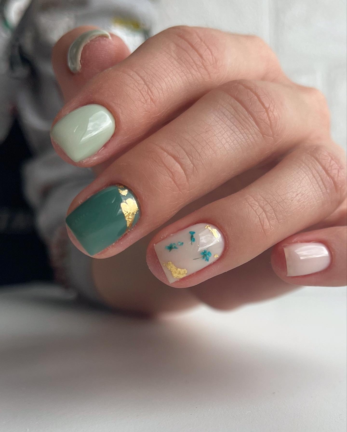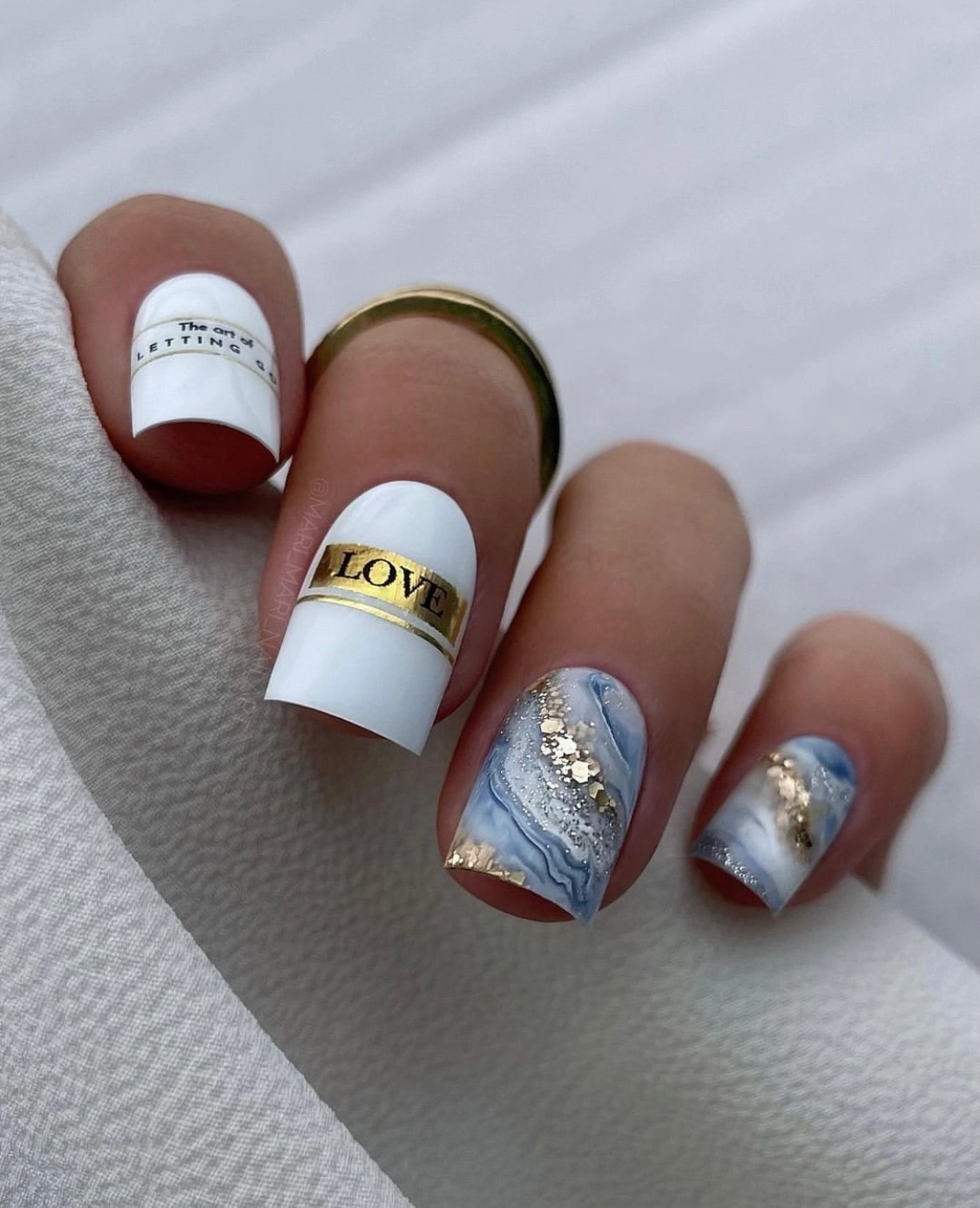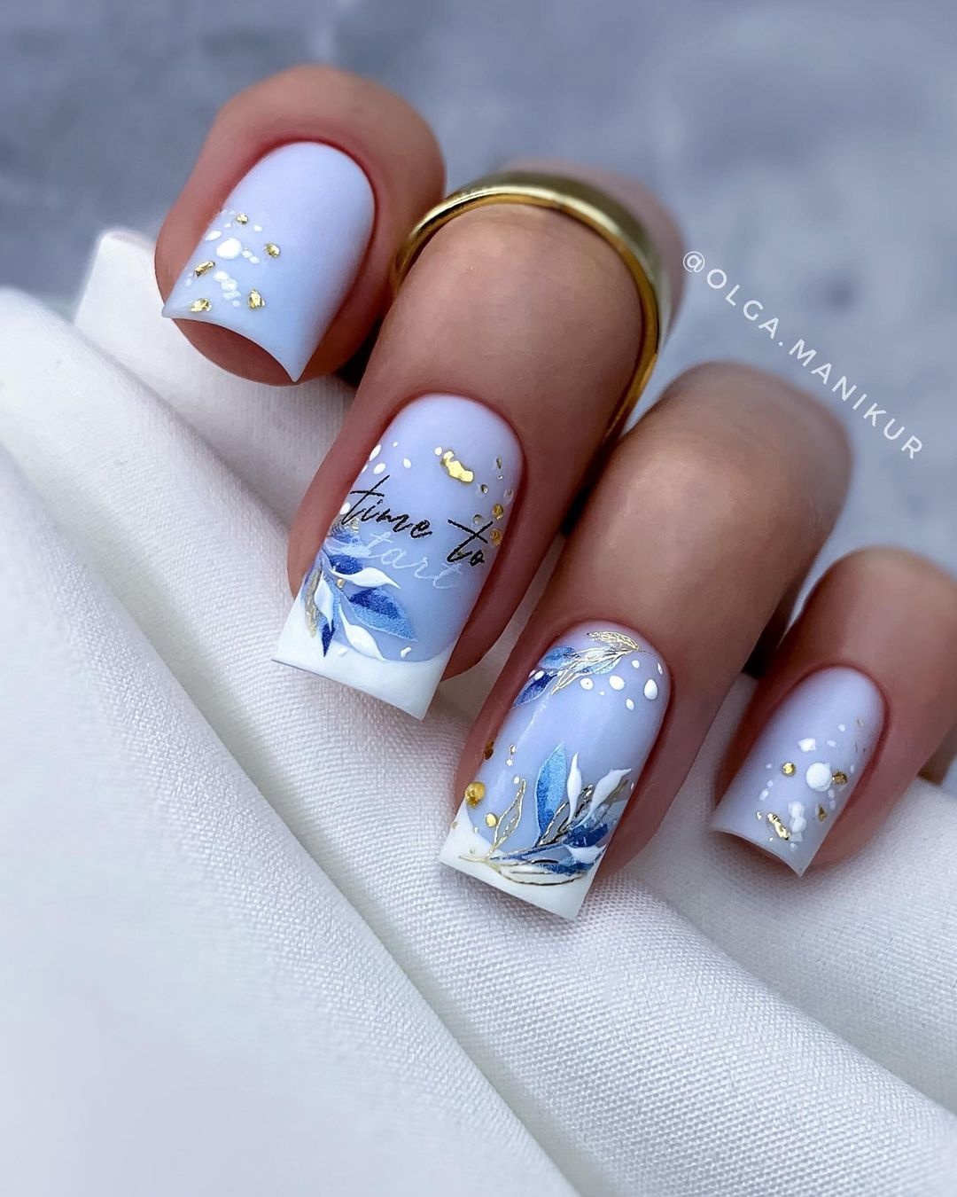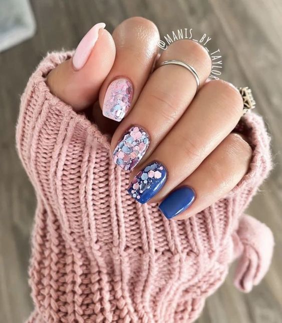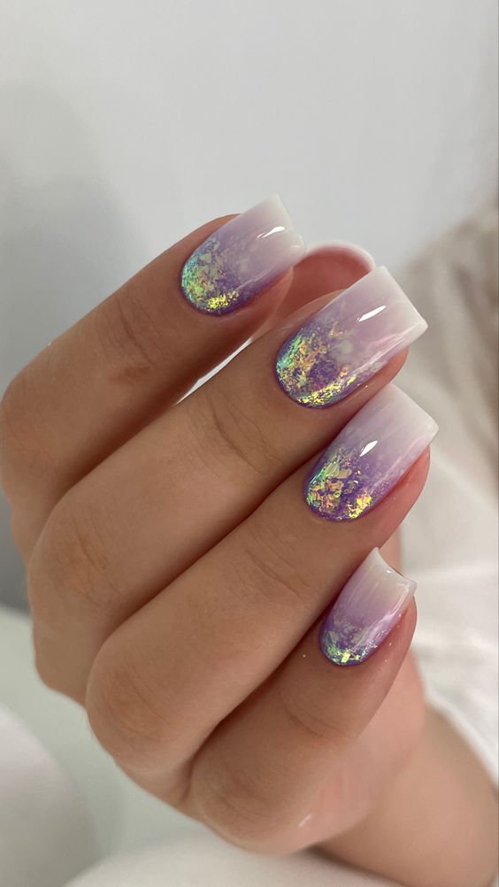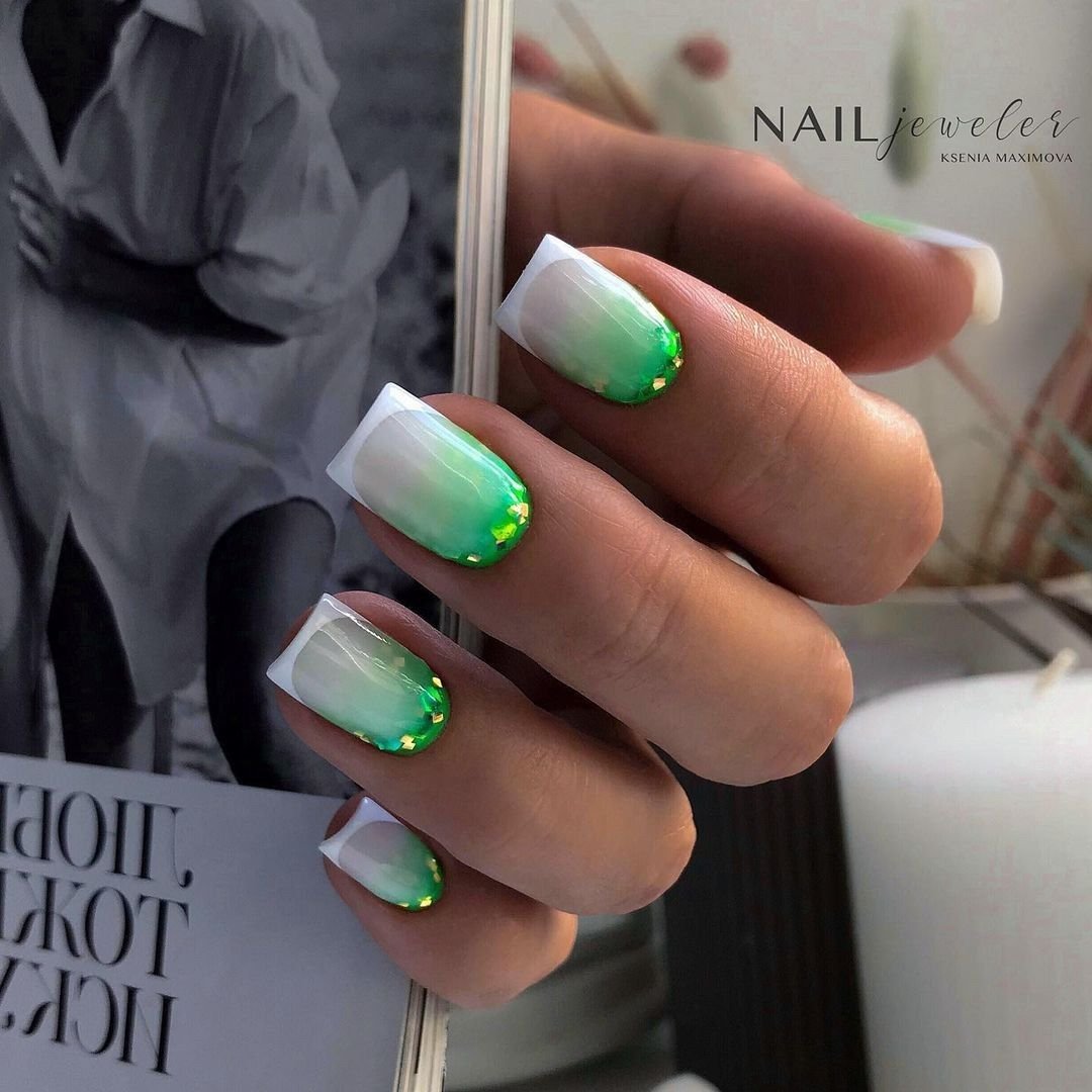 Если вам нужно добавить блестящий акцент стоит выбрать фольгу. Она может использоваться как подложка или как хаотичные акценты. Чем неаккуратнее будут разбросаны фольгированные кусочки на ногтях, тем интереснее и актуальнее.