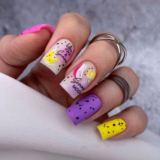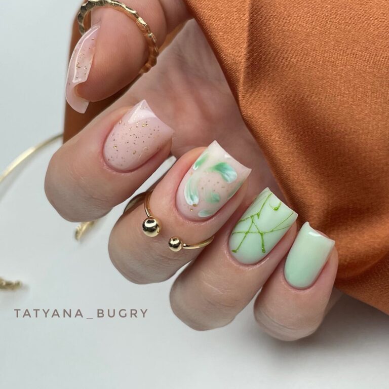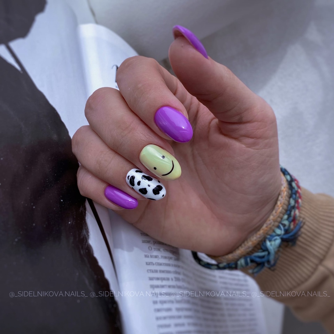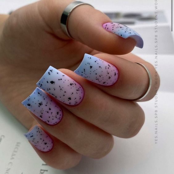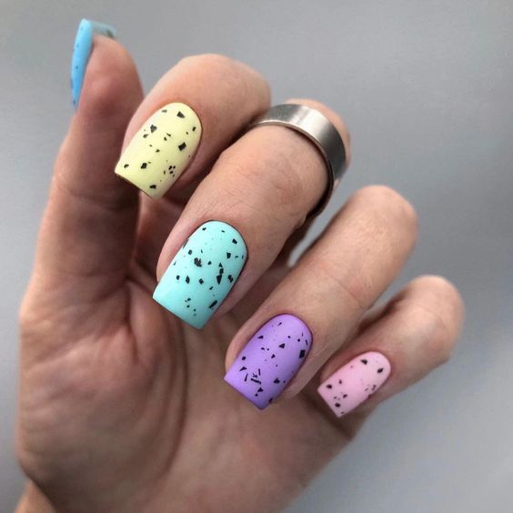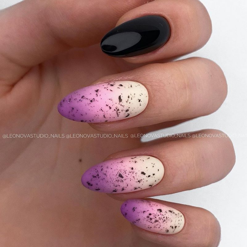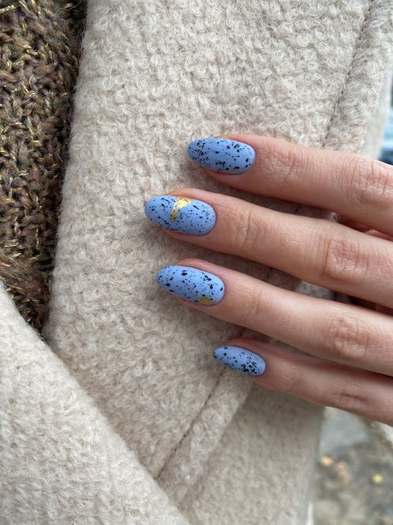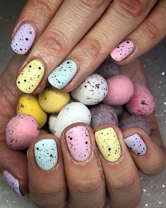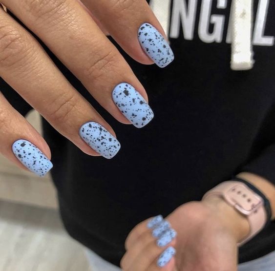 Эта текстура довольно долго была на пике популярности после появления в нейл-арте. Но затем наступила некоторая усталость и про нее забыли. В августе 2026 маникюр с эффектом перепелиного яйца вновь популярен. Но этим летом мы рекомендуем сочетать пятнистую фактуру, например, с матовой поверхностью или рисунками.