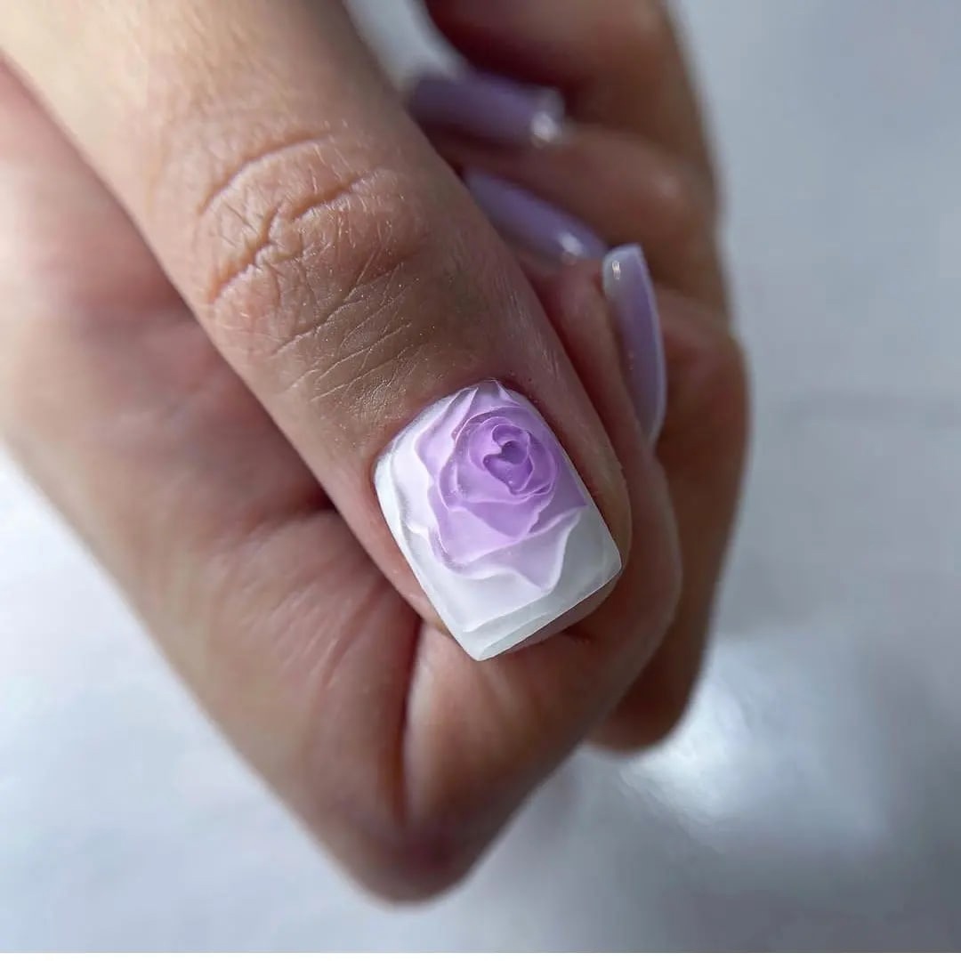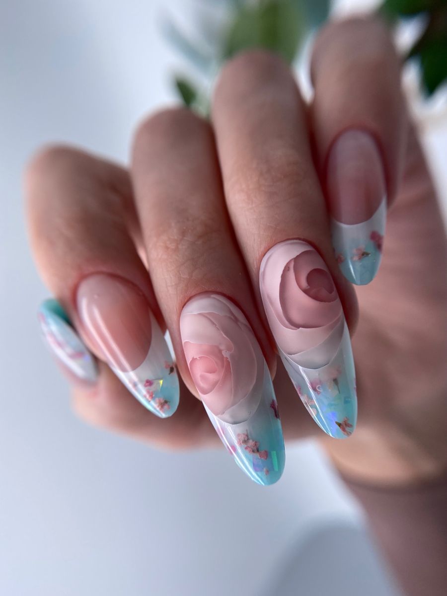 В августе предлагаем обратить внимание на технику создания маникюра, которая известна под названием 3D. Но мы сейчас говорим не о лепке из полимерной глины или других объемных фигурах, а о дизайне, который можно отнести к хитам Инсты. Чаще всего в такой технике мастера создают розы. И если поверхность ногтя остается идеально гладкой и прозрачной, то «внутри» происходит настоящая магия. Роза (другой цветок, цветные разводы) выглядят фактурно и очень объемно. Такой маникюр напоминает игру » в секретики», когда в детстве девочки закапывали красивые цветные стекла в землю, под которыми располагали красивые рисунки или фольгу.