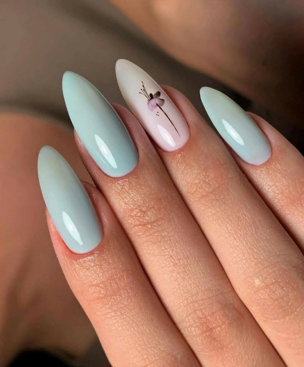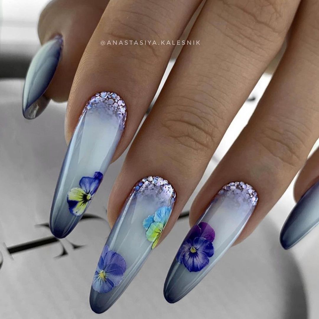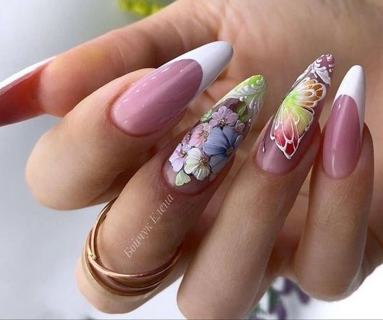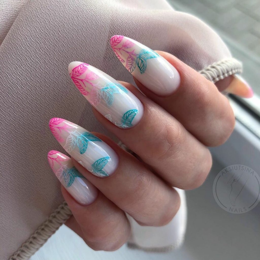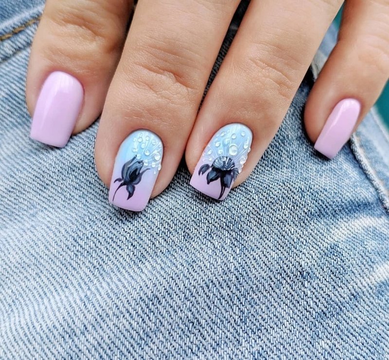 Техника омбре — одна из самых любимых у модниц. Мастер может использовать всего два оттенка или смиксовать больше. Переход должен быть плавным. Часто омбре дополняют рисунками. но обратите внимание, что они должны быть не слишком активными, чтобы не отвлекать внимание от основной техники.