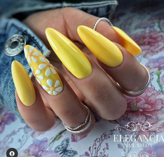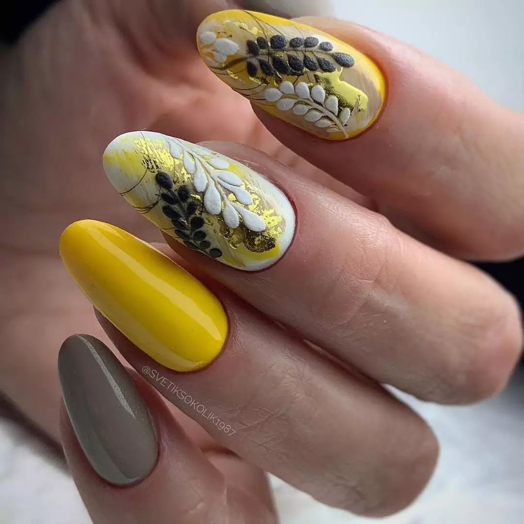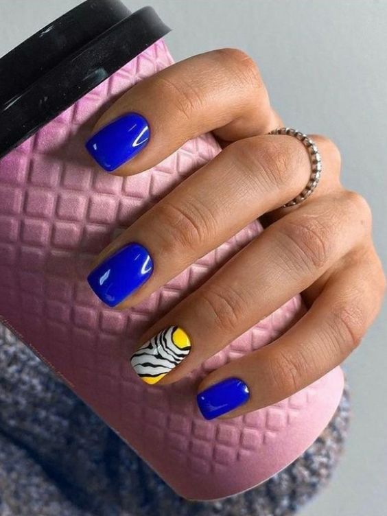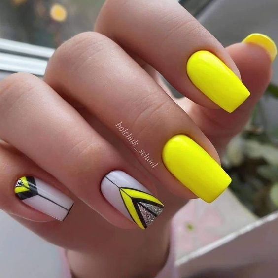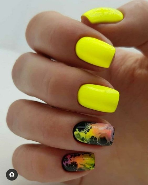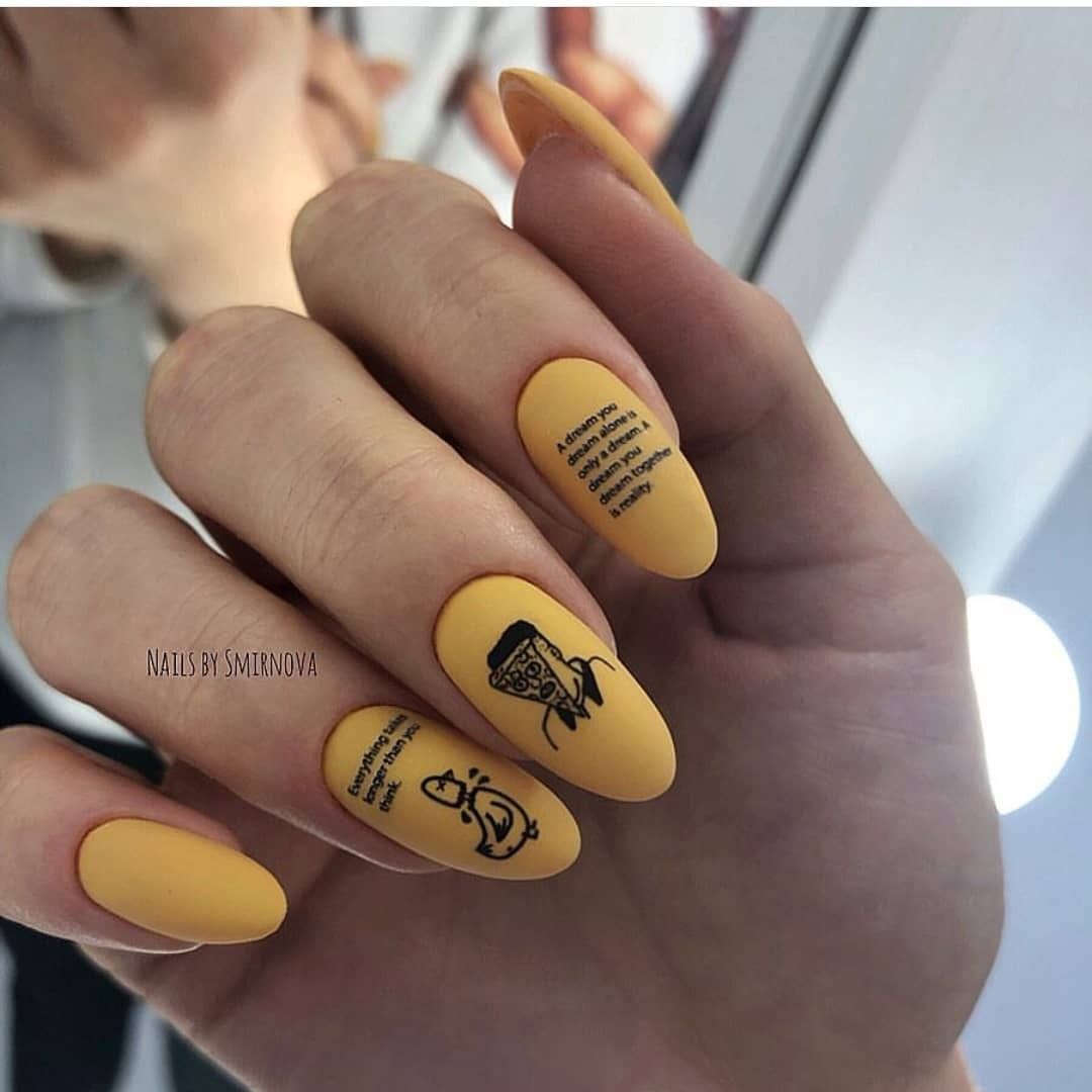 Наберитесь смелости сделать маникюр солнечно-желтого цвета. Это очень жизнерадостный оттенок, но многие модницы наверняка ни разу не «носили» на ногтях. Все дело в его активности, которая многих смущает. Пока тренд актуален, самое время решиться. У вас есть на выбор несколько вариантов — покройте ногти желтым в один тон или используйте его в качестве фона для дизайна (например, графичного).