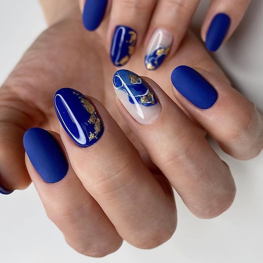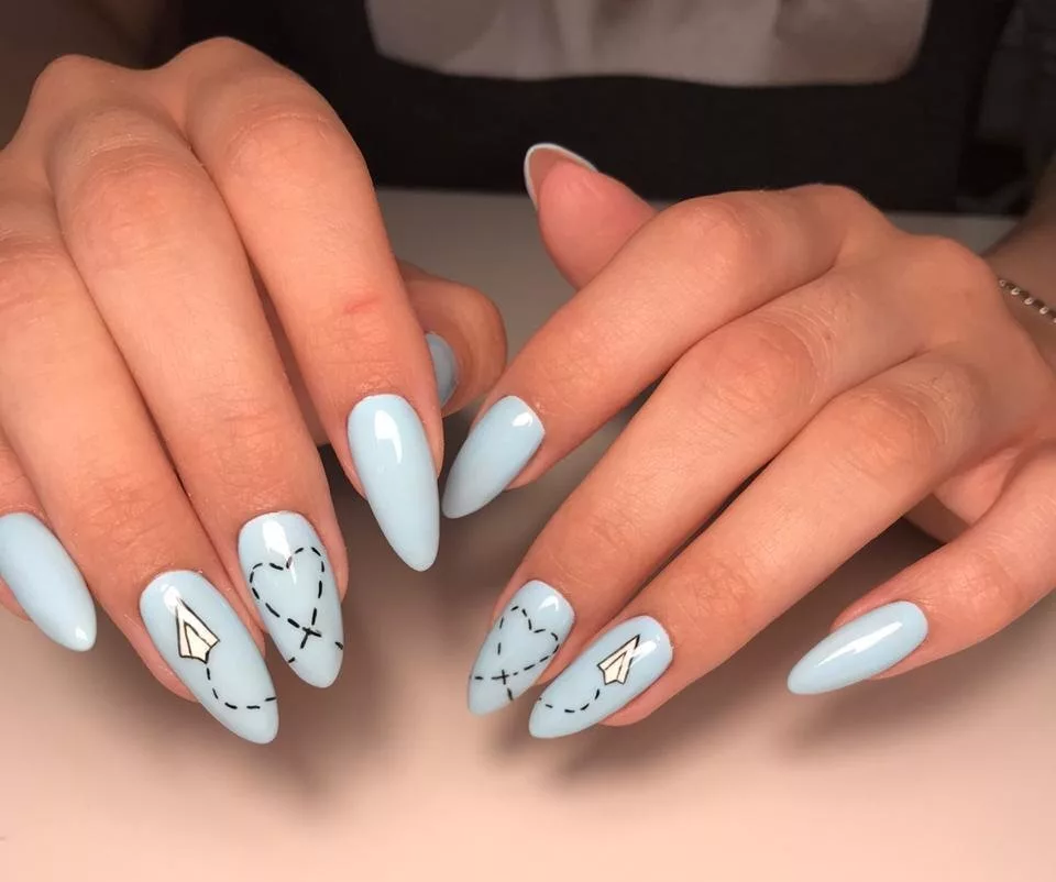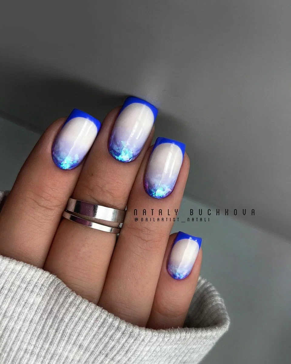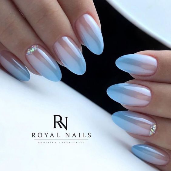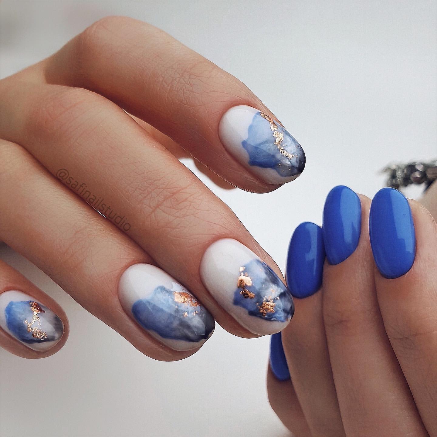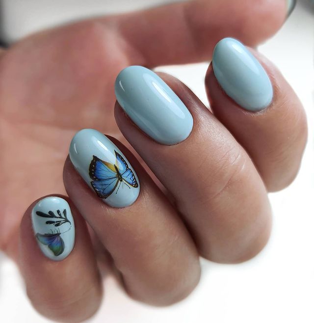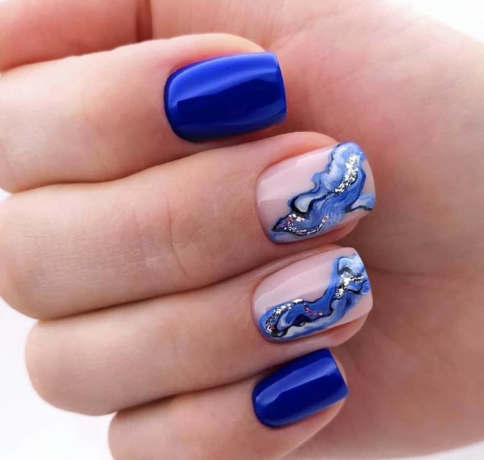 Синяя палитра актуальна не только в августе. Но в конце лета рекомендуем обратить внимание на сине-голубую гамму. В этом сезоне в моде и светлый, как облако, голубой цвет, и темный иссиня-черный лак. Особенно модным мастера называют ледяной голубой.
