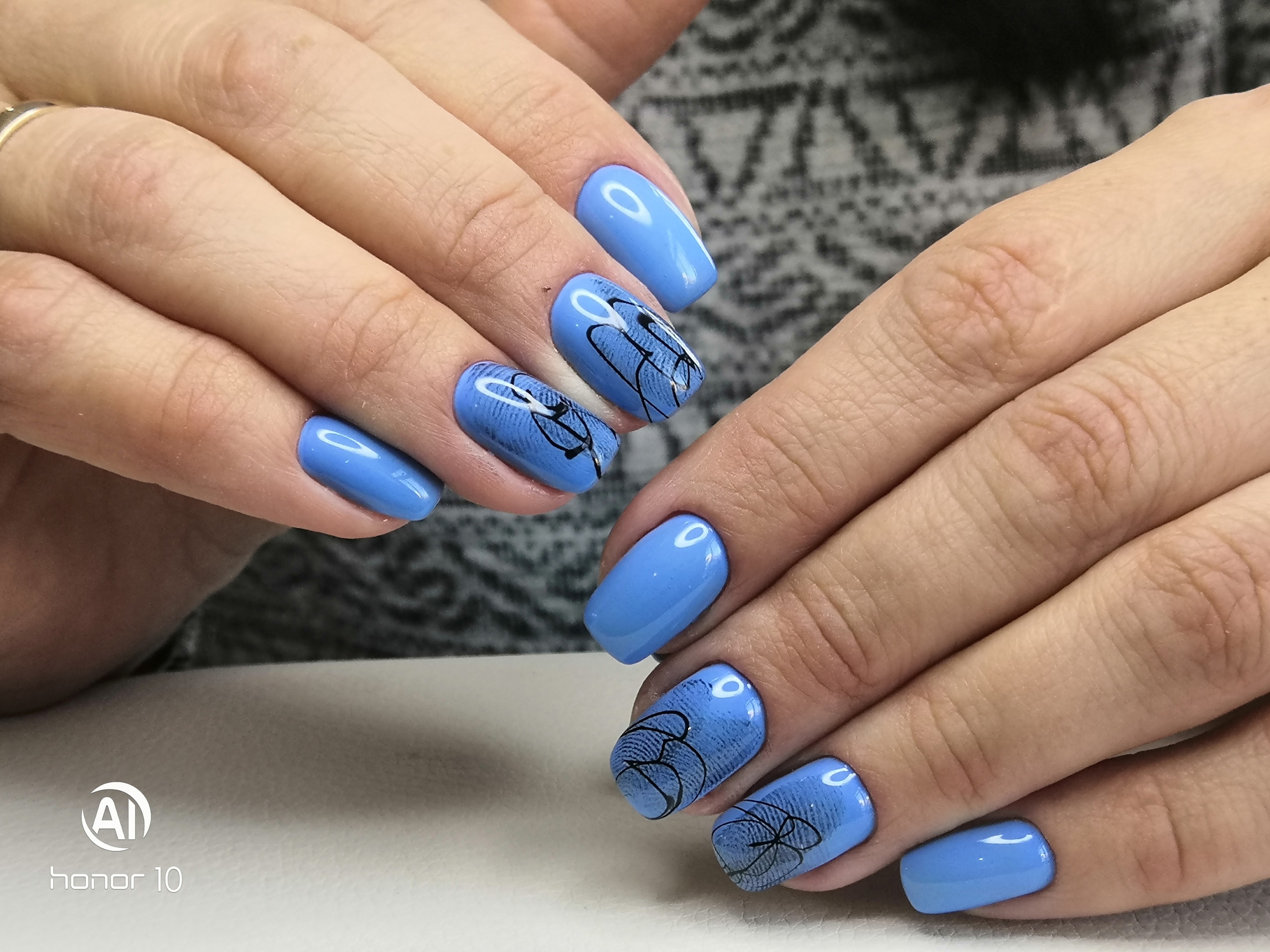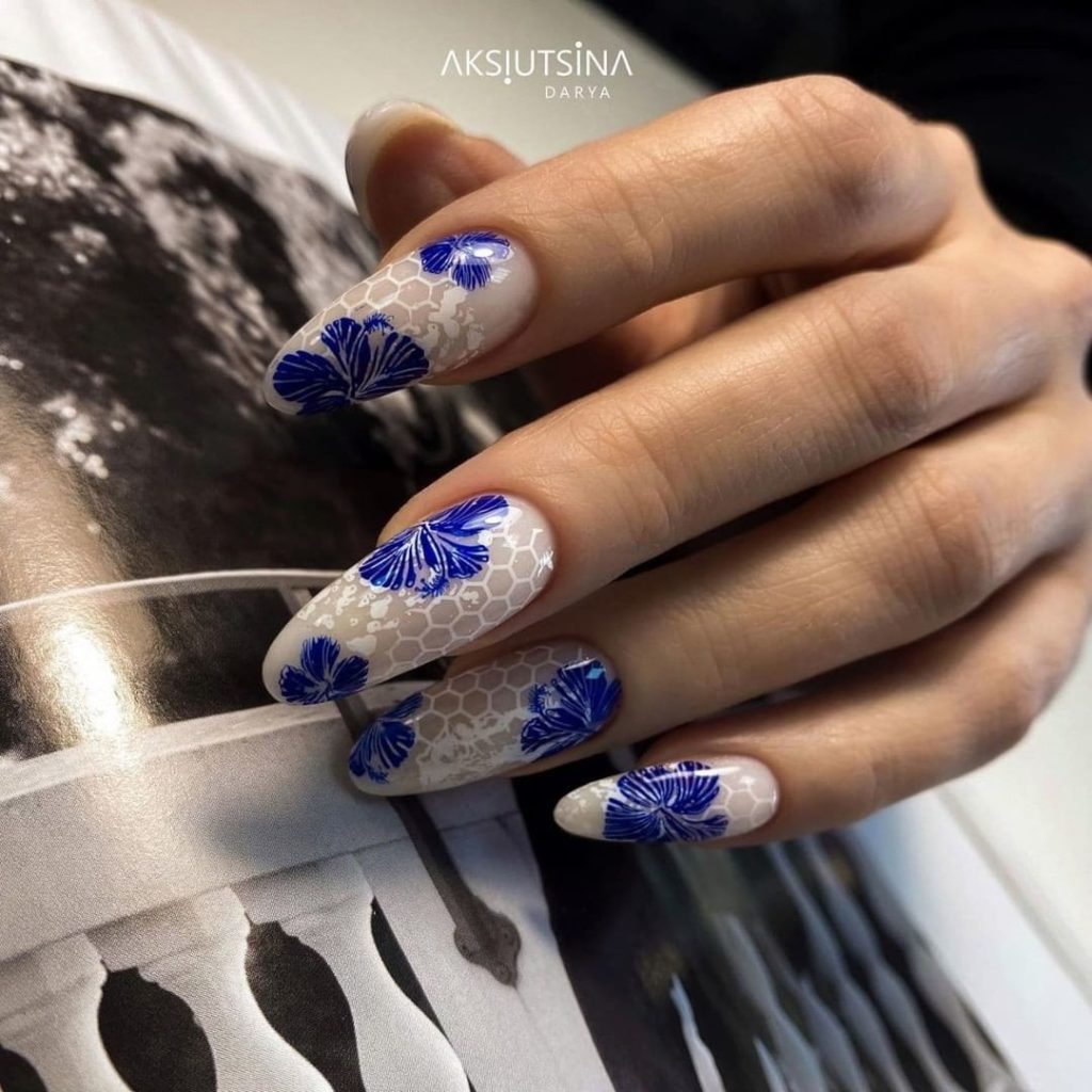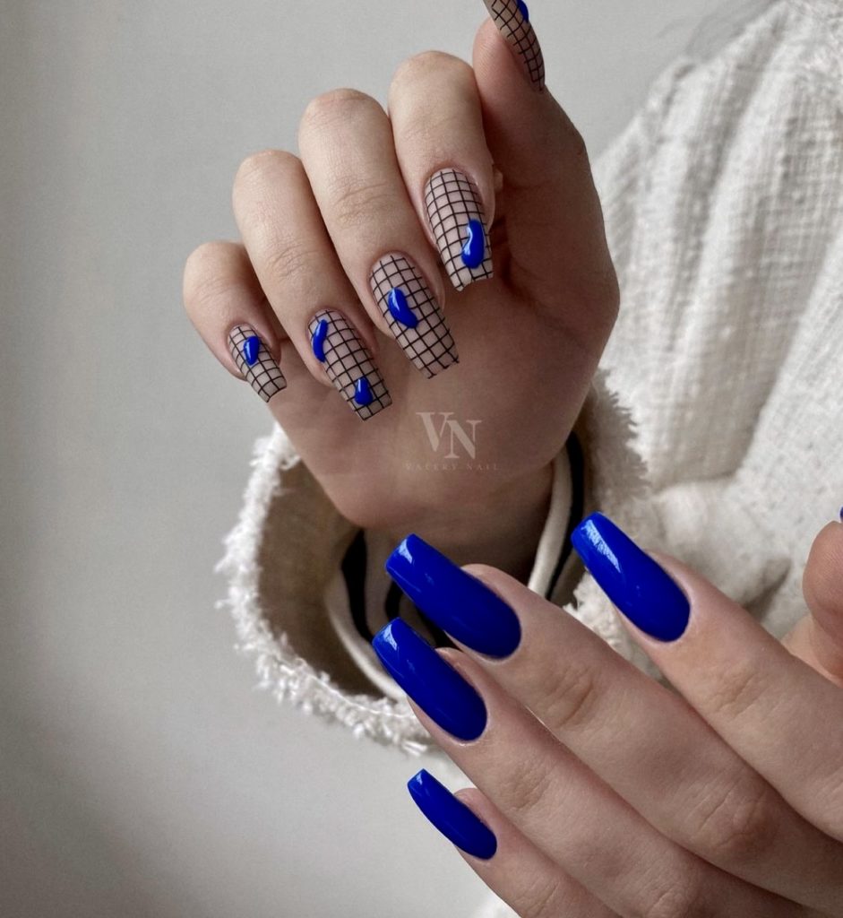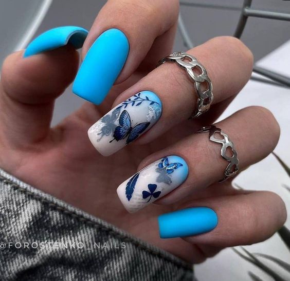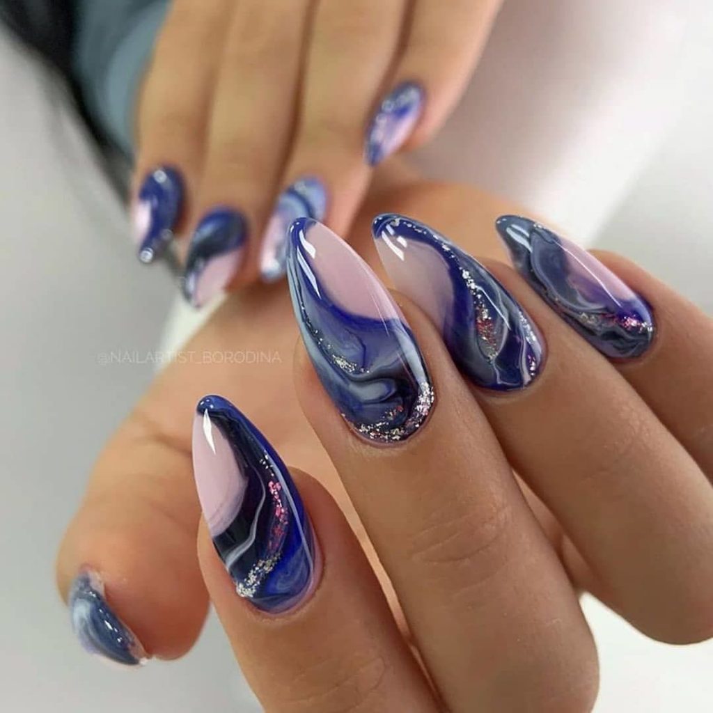 Синяя палитра актуальна не только в августе. Но в конце лета рекомендуем обратить внимание на сине-голубую гамму. В этом сезоне в моде и светлый, как облако, голубой цвет, и темный иссиня-черный лак. Особенно модным мастера называют ледяной голубой.