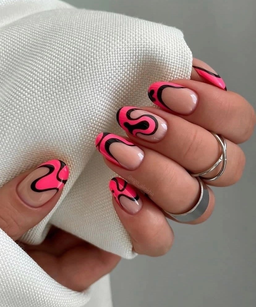 - творческий беспорядок. Еще один очень интересный дизайн — хаотичные штрихи на цветной базе. Это поистине летний маникюр, который особенно актуален в августе.